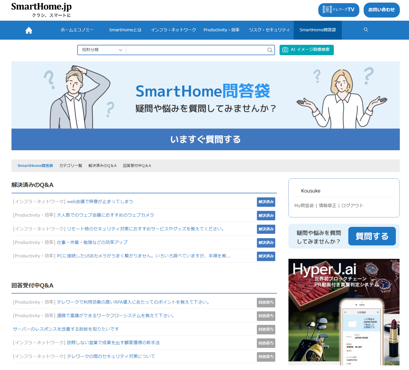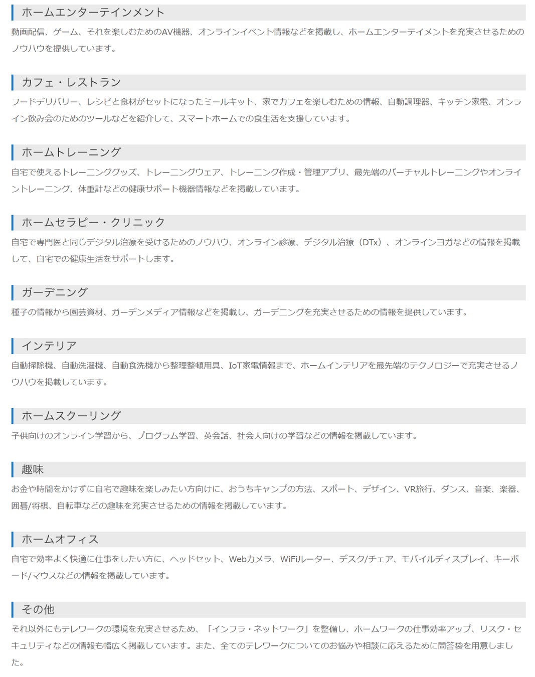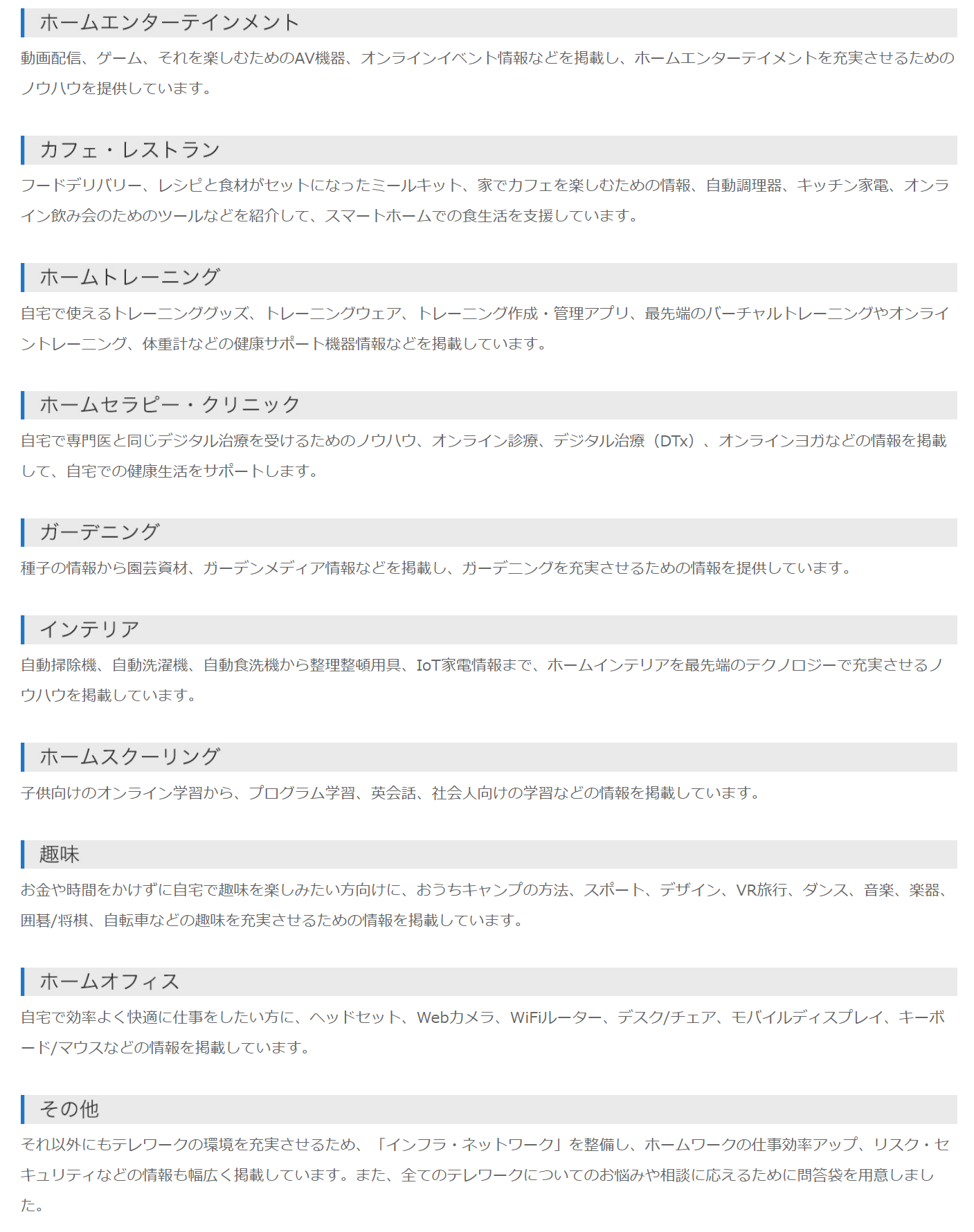 またこれらの10カテゴリ以外にも、テレワークの環境を充実させるため、「インフラ・ネットワーク」を整備し、ホームワークの仕事効率アップ、リスク・セキュリティなどの情報も幅広く掲載しています。さらにテレワークのお悩みや相談に応える掲示板「スマートホーム問答袋」をご用意しました。