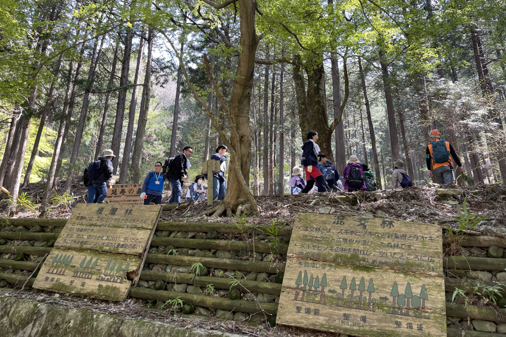 ① 森林整備班: 作業現場まで約1時間かけて傾斜のある山林を登り、苗木の成長を妨げるかん木や雑草、苗木に絡まったつる植物を取り除き、苗木がスムーズに成長できるように整備しました。