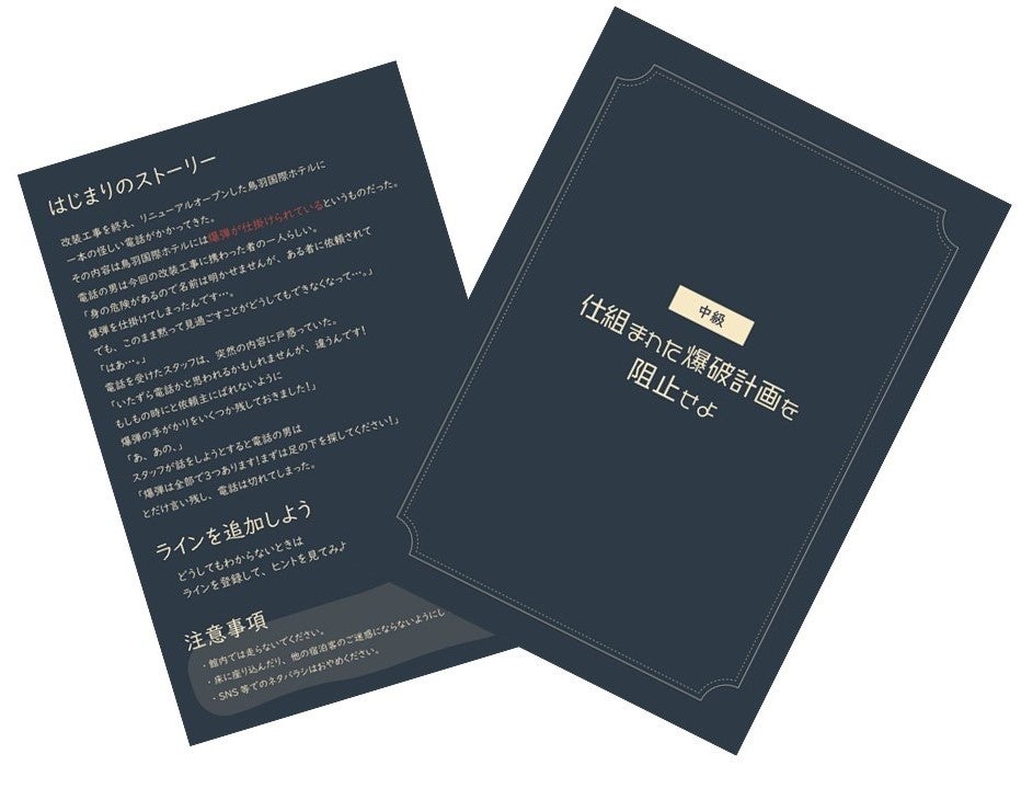 鳥羽国際ホテルから依頼を受けた“あなた”は、鳥羽国際ホテルご宿泊中に爆弾の在りかを探し出し、さらには解除できるのか?