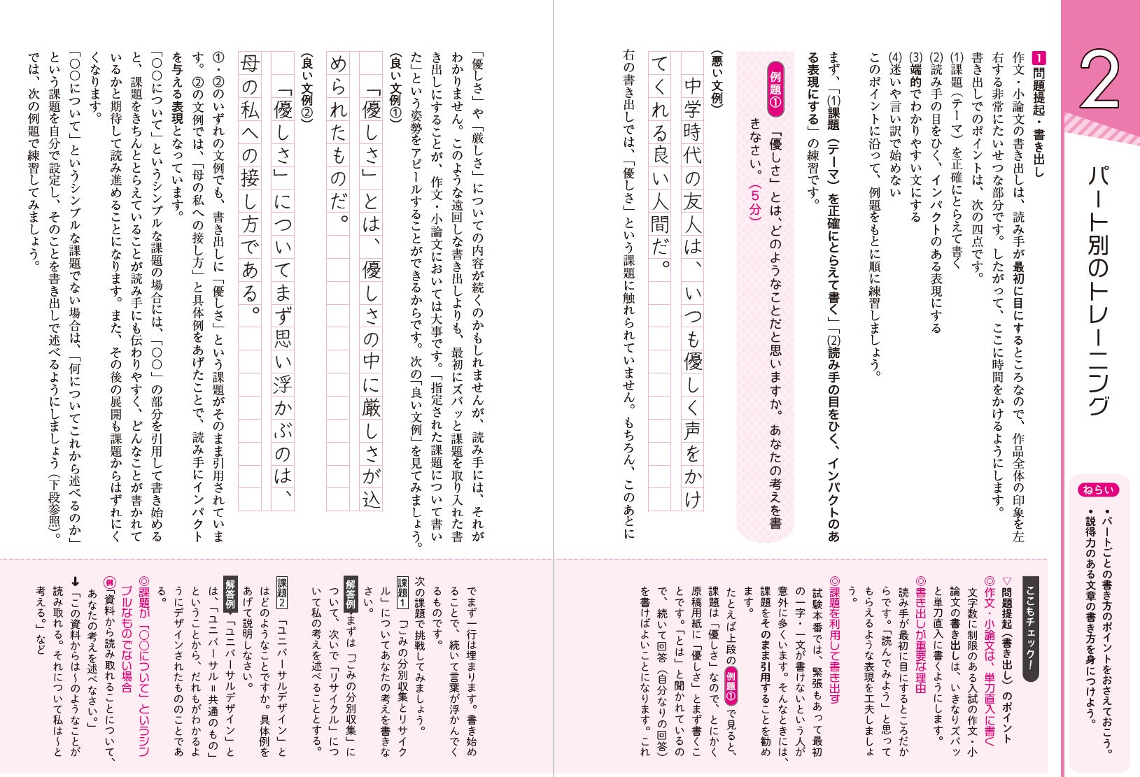 実際の試験で出題された問題を使って、解答例を示しながらくわしく書き方を説明しているので、しっかりと作文・小論文の試験対策ができます。