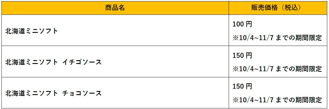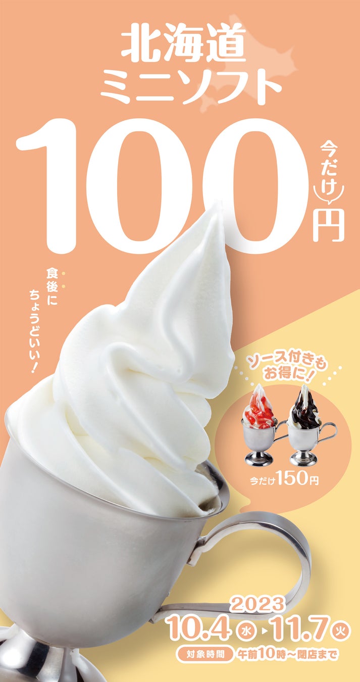 株式会社アレフ(本社:北海道札幌市、代表取締役社長:庄司 大)が展開するハンバーグレストラン「びっくりドンキー」は、10月4日(水)〜11月7日(火)の期間限定で、通常価格200円(税込)の「北海道ミニソフト」を100円(税込)で販売します。また、150円(税込)で「北海道ミニソフト イチゴソース」「北海道ミニソフト チョコソース」もお得に愉しめます。(通常価格:250円(税込))