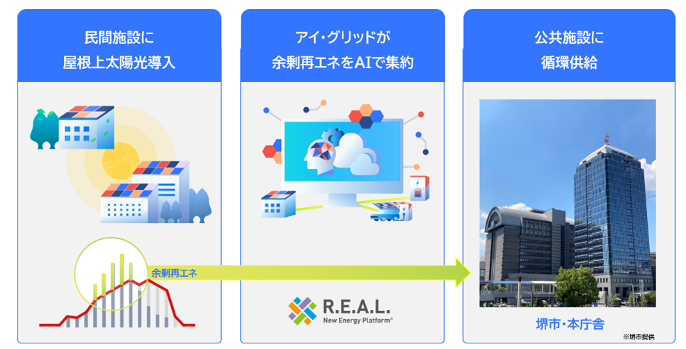 株式会社アイ・グリッド・ソリューションズ(本社:東京都港区、代表取締役社長:秋田 智一、以下「アイ・グリッド」)は、堺市内の複数の民間施設に分散して設置された屋根上太陽光発電所の余剰電力を集約し、堺市役所本庁舎(本館・高層館)へ供給する取り組みが本格始動したことをお知らせします。