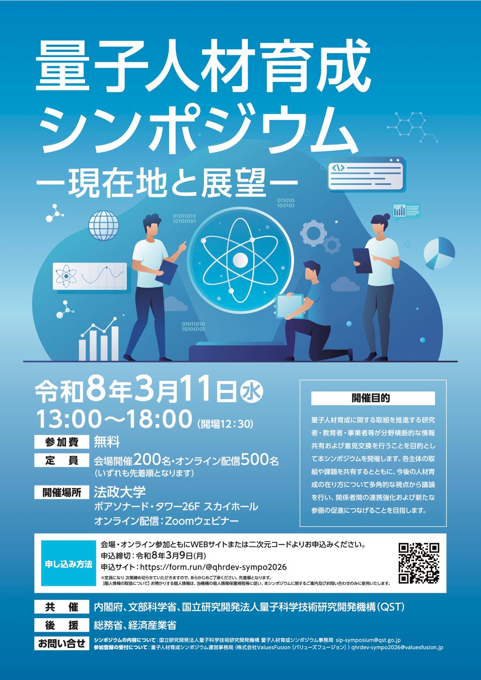 内閣府、文部科学省、量子科学技術研究開発機構は、戦略的イノベーション創造プログラム(SIP)第3期課題の一つ「先進的量子技術基盤の社会課題への応用促進」、研究開発とSociety 5.0との橋渡しプログラム(BRIDGE)、及び光・量子飛躍フラッグシッププログラム(Q-LEAP)等、量子人材育成に取り組む国内外の機関・事業の情報共有・横断的協働を促進する場として、本シンポジウムを開催します。
