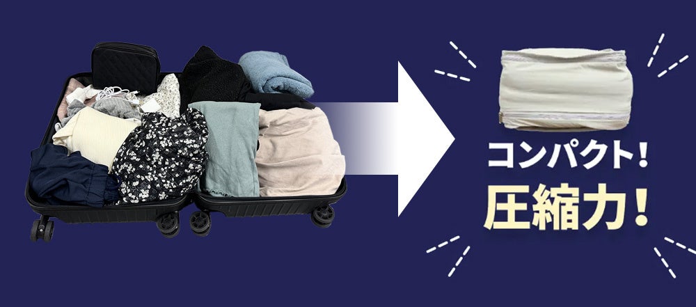 コンプレッション トラベルポーチは、たくさん入れても、ただしまうだけでなく、圧縮ができます。