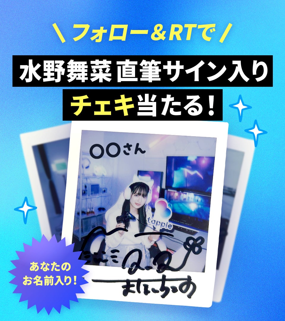 内容:タップルの公式X(旧Twitter)をフォローしたのち、キャンペーンポストをリポストすると抽選で水野舞菜の直筆サイン入りグッズが当たります。