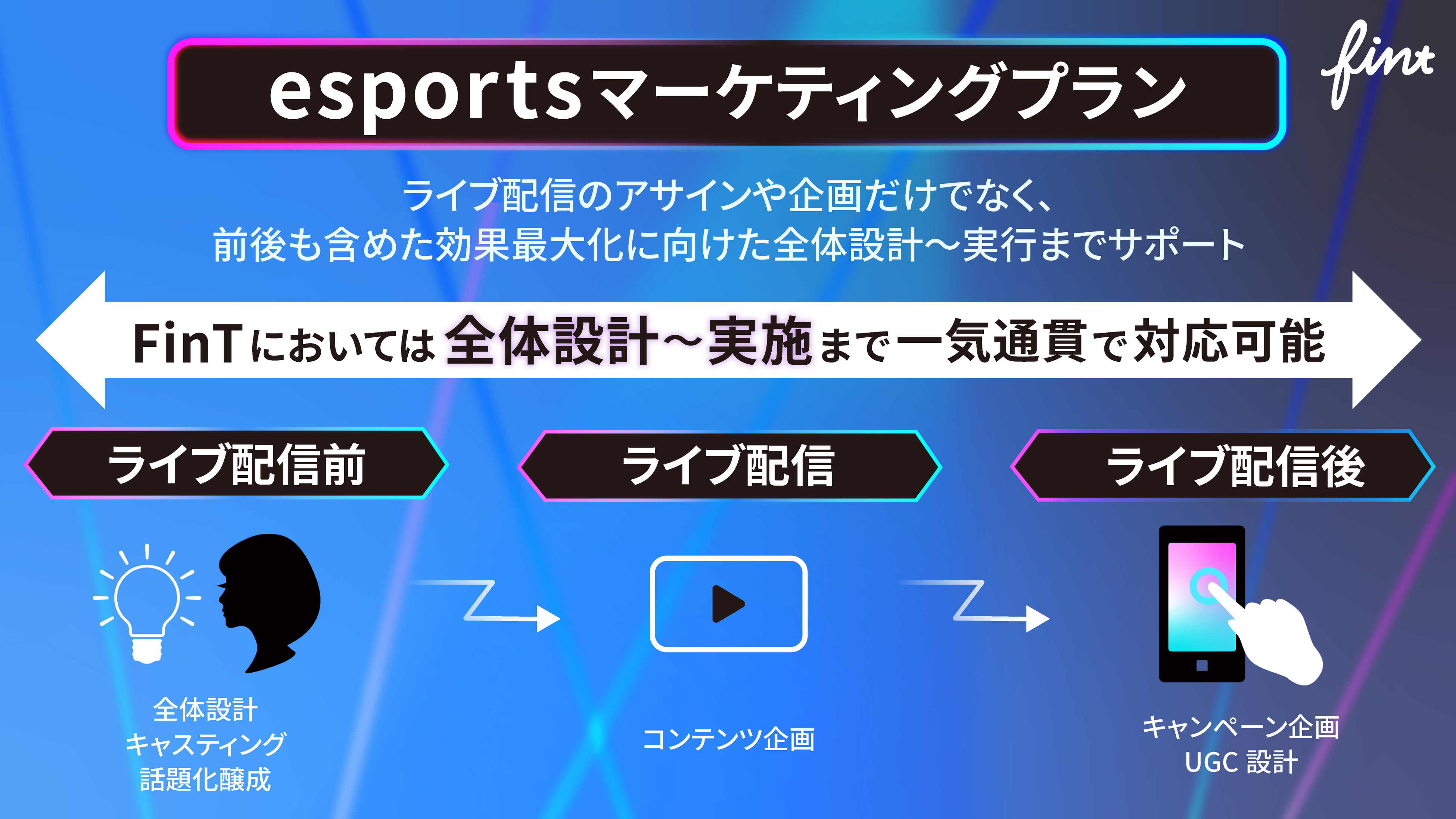 FinTでは、今まで数多くのesportsマーケティングの経験が溜まっており、ナレッジとして提供することが可能です。