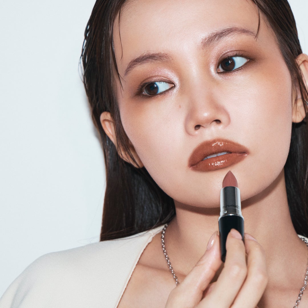 「マキシマル シルキー マット リップスティック クール テディ」は、キットに絶対入れたかった推しリップ!くすみ感はあるけれど顔色が沈まない、ピンクとベージュのいいとこ取りをしたような絶妙なカラーなんです。これと「M·A·C リップグレイザーワーリン」で輪郭を取りながらグラデにして、最後にグロスでツヤツヤにすれば、甘すぎないんだけど大人のかわいさも感じられるようなピンクメイクの出来上がり。
