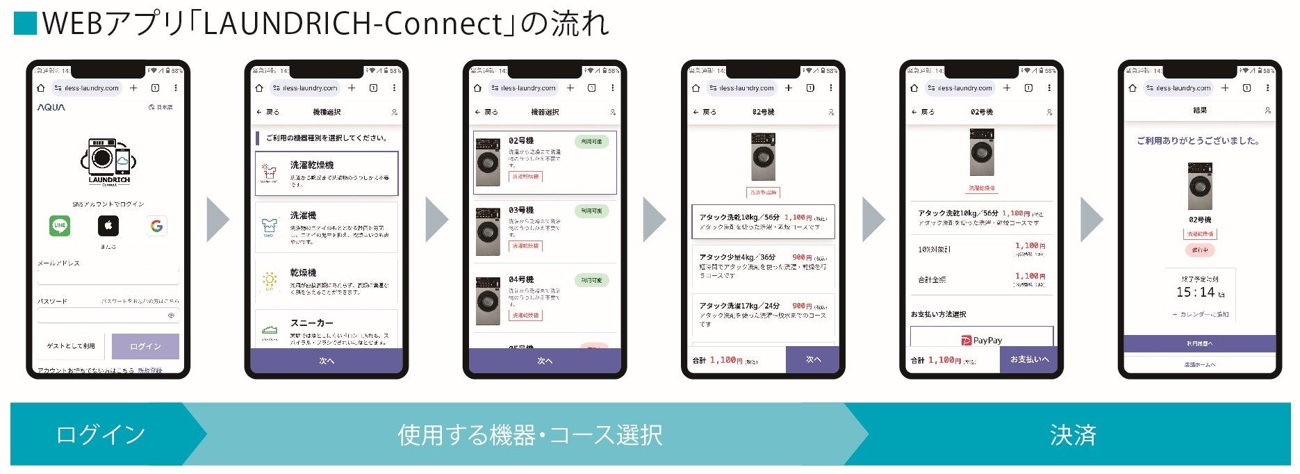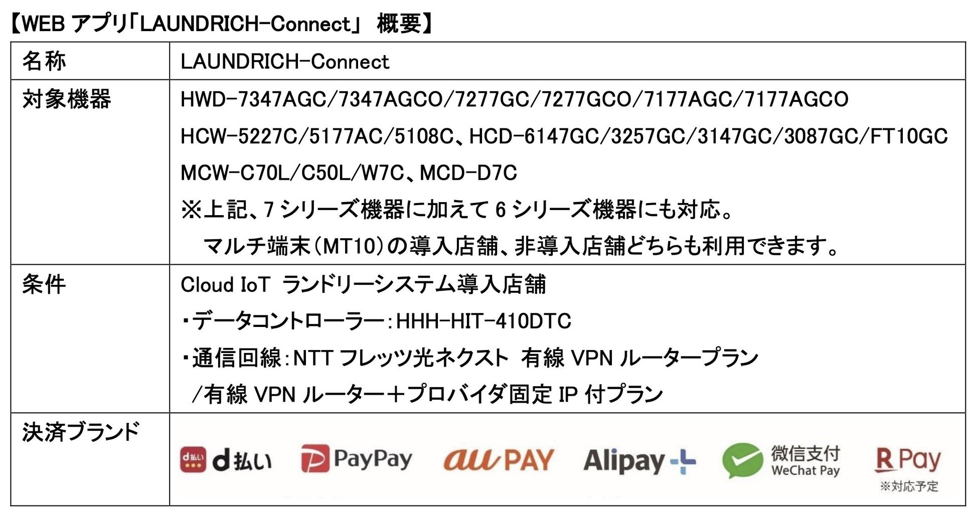 アクア株式会社(本社:東京都中央区、代表取締役社長 兼CEO:杜 鏡国)は、この度、コインランドリーの運営を効率化させるシステム「Cloud IoTランドリーシステム」導入店舗専用のWEBアプリ「LAUNDRICH-Connect」(以下、本アプリ)をリリースし、現在、各種WEB決済機能が追加される新サービスの申し込みを受付中です。