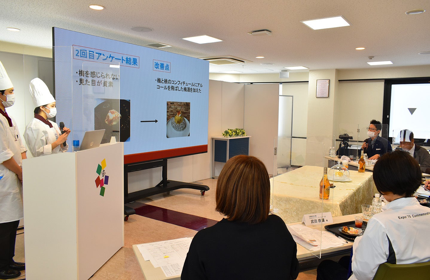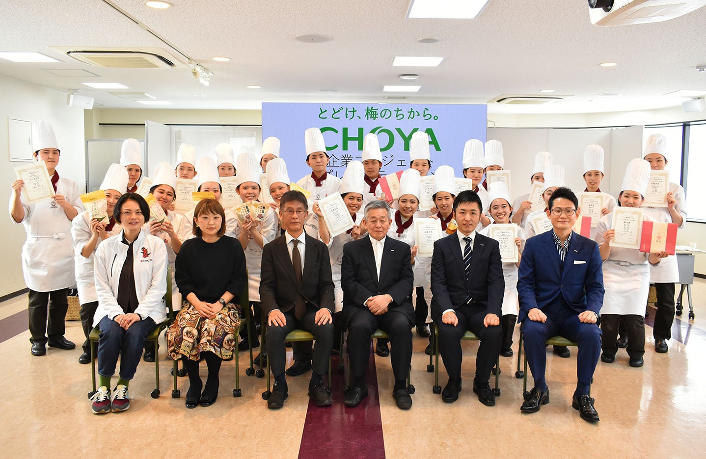 チョーヤ梅酒株式会社 (本社:大阪府羽曳野市、社長:金銅重弘、以下チョーヤ) は、大阪キャリナリー製菓調理専門学校 (所在地:大阪市西区、学校長:内山加代子、以下大阪キャリナリー) と協力し、Z世代の新しい発想で梅産業を盛り上げ、日本の梅文化を次世代に紡ぐ事を目的とし、2022年4月に日本の梅に特化したカリキュラムを大阪キャリナリーの製菓・製パン科 パティシエ & ショコラティエコース内に1年度限定で開設。大阪キャリナリーの生徒27名が7つのグループに分かれ、「梅の半生スイーツ部門」、「梅の焼き菓子部門」、「梅ドリンク部門」の3部門においてメニュー開発に取り組みました。