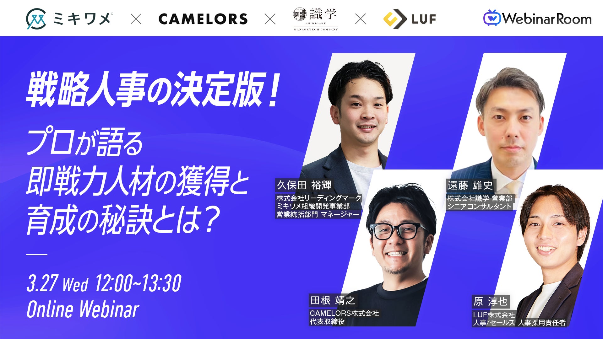即戦力人材を最速で獲得できる複業マッチング『SOKUDAN(ソクダン)』を運営する、CAMELORS株式会社(本社:東京都渋谷区、代表取締役社長:田根 靖之)は、SOKUDANを含む4社が主催する、即戦力人材の獲得と育成の秘訣について紹介する「戦略人事の決定版!プロが語る即戦力人材の獲得と育成の秘訣とは?」に登壇いたします。