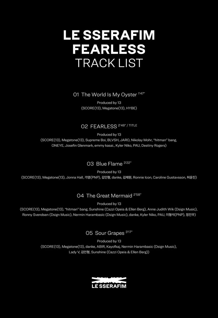 HYBE初のガールズグループLE SSERAFIM(KIM CHAEWON、SAKURA、HUH YUNJIN、KAZUHA、KIM GARAM、HONG EUNCHAE)は、デビューアルバム『FEARLESS』のトラックリストを公開しました。タイトル曲「FEARLESS」を含め、「The World Is My Oyster」、「Blue Flame」、「The Great Mermaid」、「Sour Grapes」の計5曲が収録されています。バン・シヒョク総括プロデューサーがタイトル曲「FEARLESS」と収録曲「The Great Mermaid」の作曲作業に参加し、メンバーのKIM CHAEWONとHUH YUNJINが「Blue Flame」の作詞に参加しました。