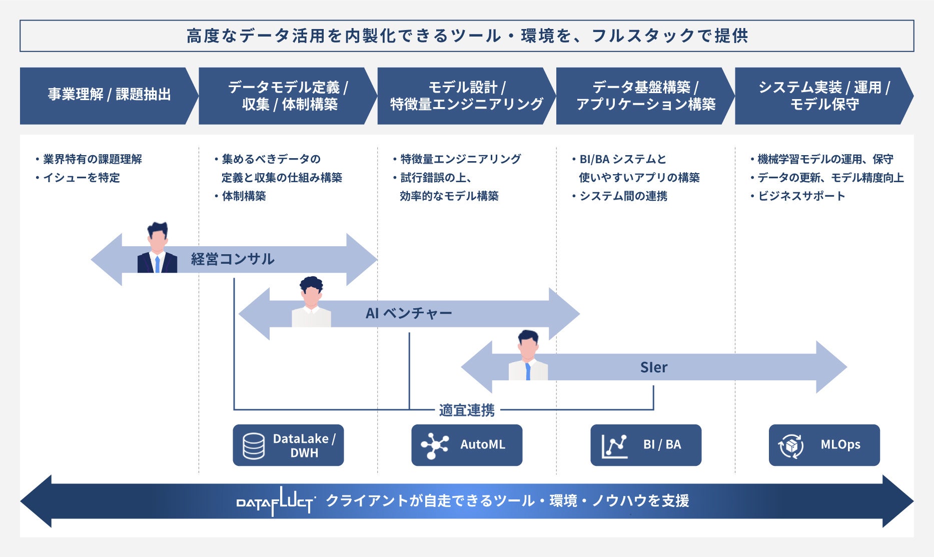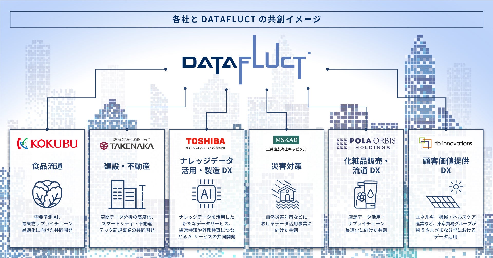各産業のリーディングカンパニーとして各社が長年蓄積してきた知見やデータと、当社が持つ高度なデータサイエンスの技術とデータを活用した新規事業創出のノウハウを組み合わせ、業界のビジネスを変革するデータビジネスを生み出し、持続可能な社会の実現に貢献します。