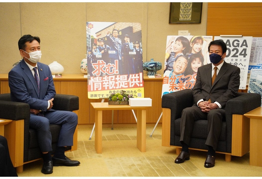 この度、杉良太郎特別防犯対策監が佐賀県を訪問しました。佐賀県庁と佐賀県警察本部を訪問した杉対策監は、佐賀県知事の山口祥義氏や、佐賀県警察本部長の松下徹氏らと対談し、佐賀県内の特殊詐欺被害情勢や対策、今後の被害防止への取り組みなどについて意見を交え、佐賀県内の特殊詐欺被害撲滅に向けたメッセージを送りました。