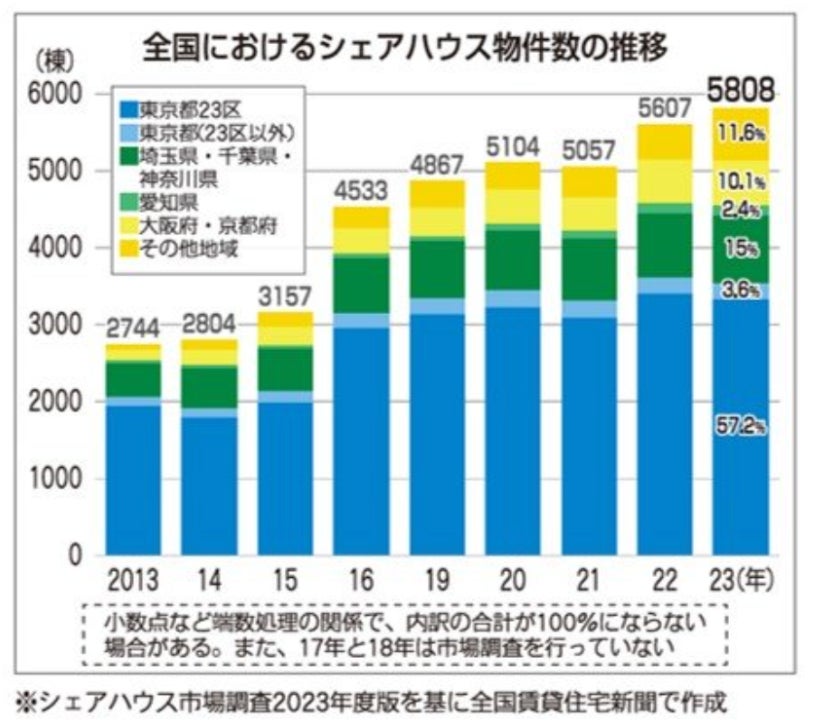 近年、首都圏の賃料上昇の煽りも受け、「初期費用を抑えたい」「人との交流を求めたい」「仕事ができる環境の整った住まいに住みたい」といった賃貸の入居者ニーズの変化を背景に、シェアハウスやコリビングの注目度が高まっています。「全国賃貸住宅新聞社」の記事によると、一般社団法人日本シェアハウス連盟(東京都渋谷区)が2023年12月1日に発表した「シェアハウス市場調査2023年度版」によると、全国の物件数は5808棟で前年度比201棟増加しており、グラフによるとその増加率は年々増加しています。