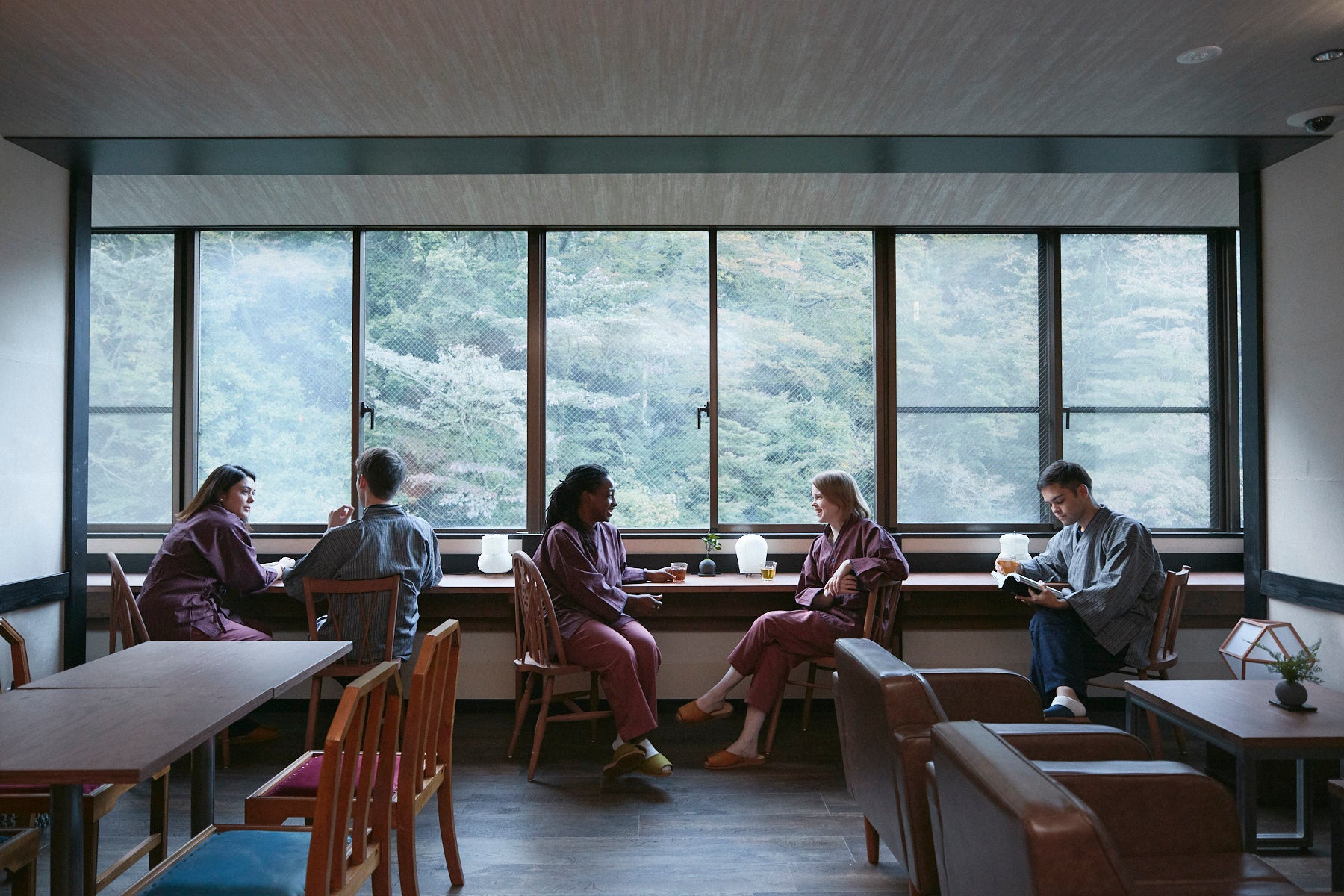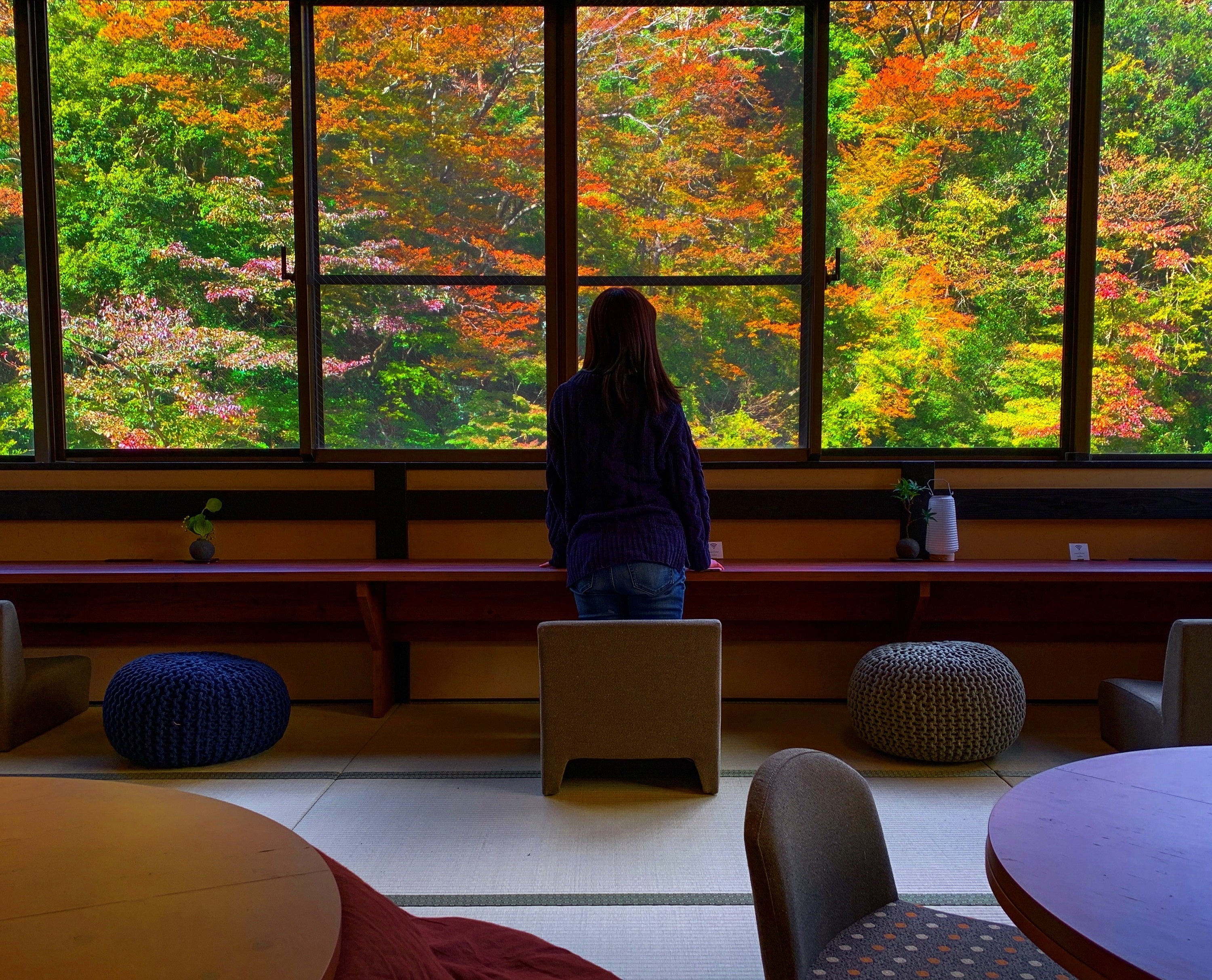 通称「温泉ラウンジ」一期一会を楽しめる場所です。Wifiと電源デスクを完備しているラウンジエリアでは、温泉を楽しみながらテレワークも可能。森と川を望む窓際のデスクスペースや、ゆったりとしたソファ、座敷のスペース、お気に入りの場所を見つけてください。ラウンジの一角に畳敷きのこたつエリアがあります。ゆったり寝転んでもくつろいでもよし。トランプ、花札、けん玉、お手玉など自由にご利用いただけます。