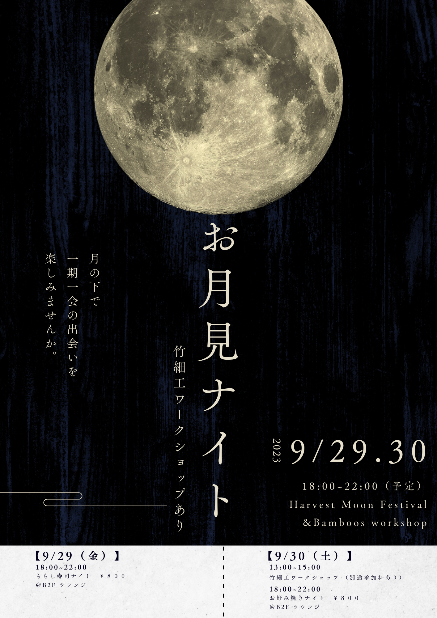 いらっしゃったお客様に日本の文化に触れていただき、お客様同士が交流できるイベントを定期的に開催しております。この度、十五夜にちなんで9月29日(金)、30日(土)の二夜連続で「お月見ナイト」を開催いたします。