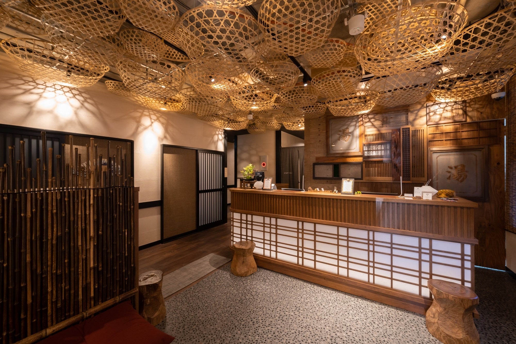 蛇骨川に面した温泉ラウンジは、風呂桶をあしらったカウンターやアンティークな家具、底倉温泉の歴史を展示したSOKOKURA GALLERY、茶屋をイメージしたベンチや銭湯をモチーフにした照明など、古き良き日本の文化を楽しめる空間です。ごゆっくりとお過ごしいただけます。