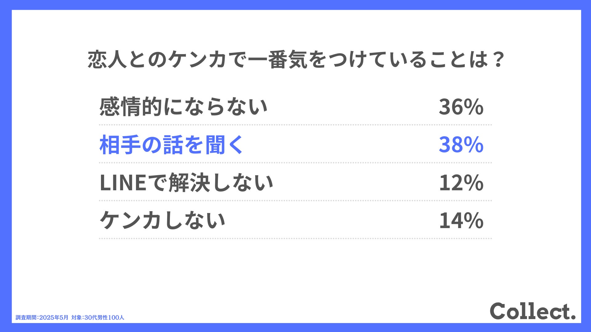 「感情的にならない(38%)」「相手の話を聞く(36%)」と、冷静なコミュニケーションを意識する声が多数。ケンカをネガティブに捉えず、関係を深めるきっかけとする姿勢がうかがえる結果となりました。