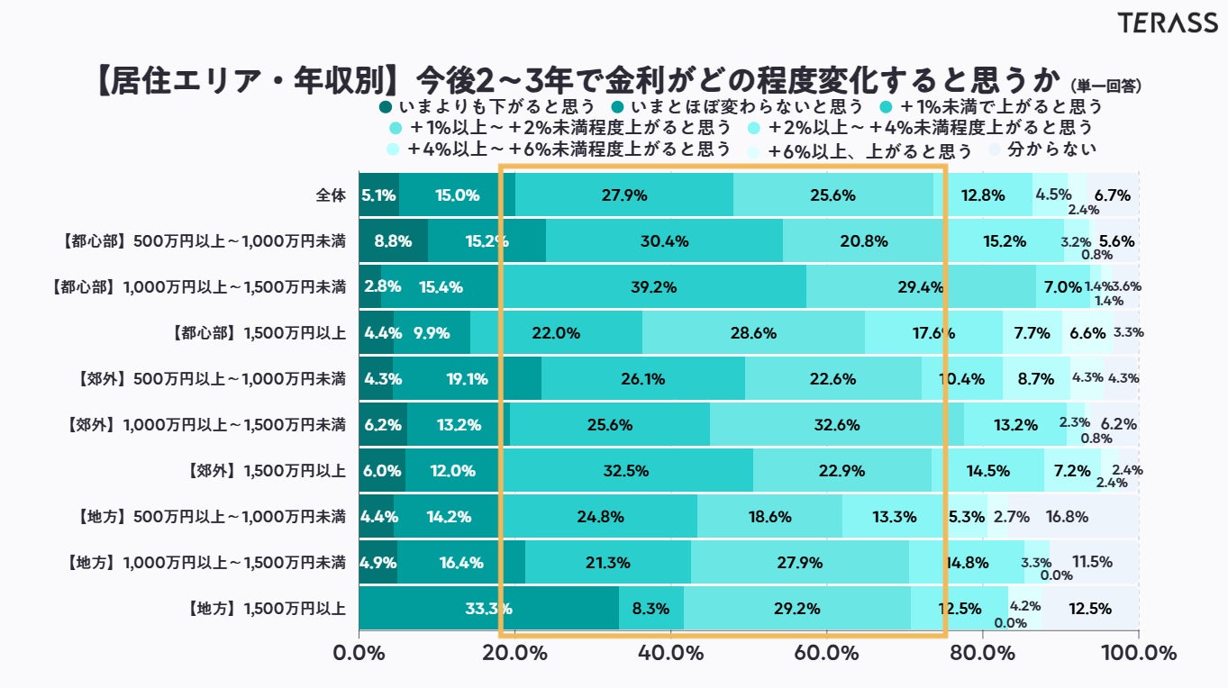 今後2~3年後の住宅ローン金利については、全体の約73%が「上がると思う」と回答しており、なかでも「+1%未満」が27.9%、「+1%以上~2%未満」が25.6%と多くなりました。また、年収が高い都心居住者ほど「今後金利は上がる」と予想する人の割合が高い結果となりました。
