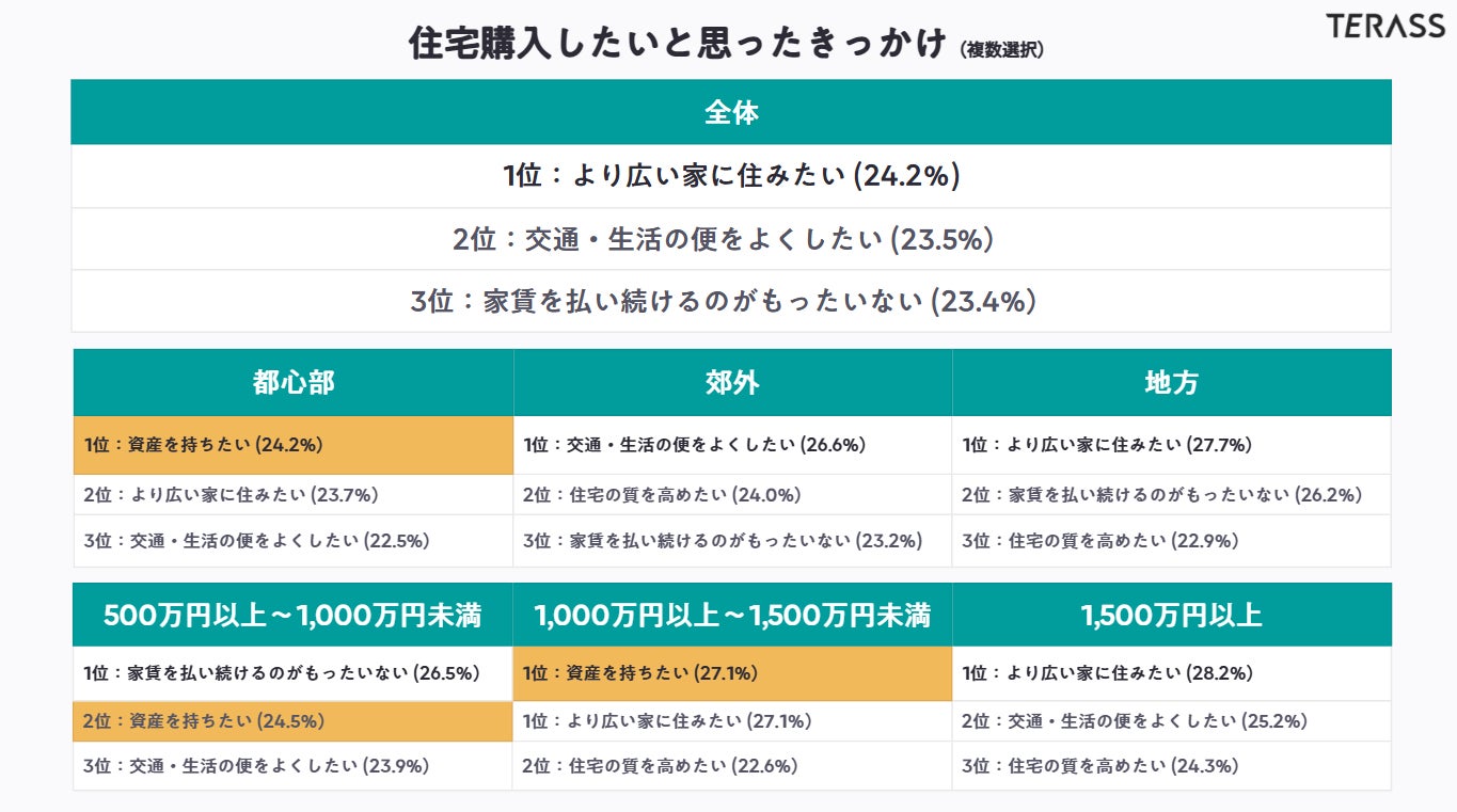 住宅購入の主な動機としては、「より広い家に住みたい」(24.2%)が全体で最多となっています。一方で、年収1,000〜1,500万円の都心居住者においては、「資産を持ちたい(=住宅を資産形成の手段と捉える)」が最多の動機でした。これは、将来的な価値の上昇を見据えて住宅を購入しようとする姿勢を示しており、居住と資産形成の両面から住宅を捉えている層が多いことがうかがえます。
