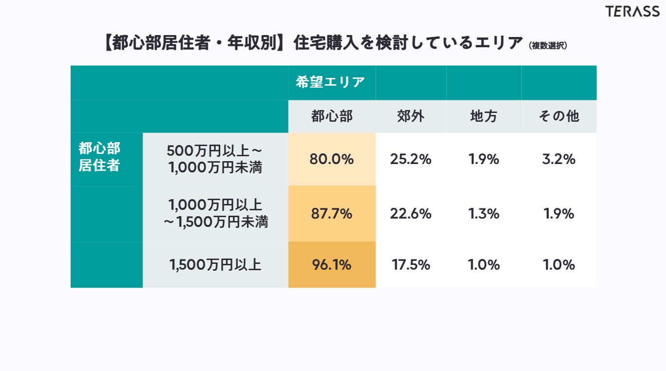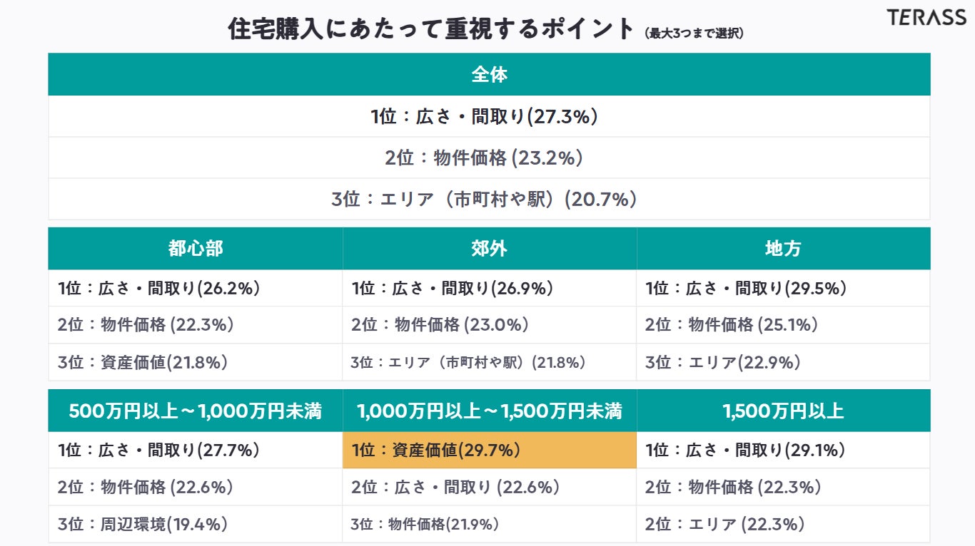 また、住宅購入時に重視するポイントについては、全体で「広さ・間取り」(27.3%)が最多となり、次いで「物件価格」(23.2%)、「エリア(市町村や駅)」(20.7%)が続きました。一方で、エリア別に見ると、都心居住者では「資産価値」への注目度が高くなり、特に年収1,000~1,500万円の層では「資産価値」が29.7%と最も高い結果となりました。購入後の価格維持や上昇を視野に入れた意思決定が、都市部ほど一般化していると考えられます。