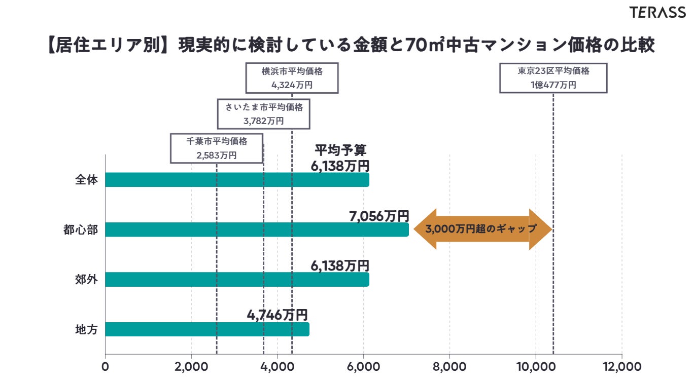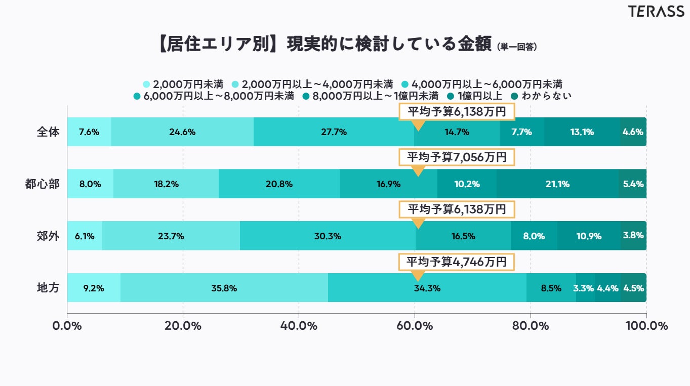 住宅購入検討者が現実的に検討している金額は、平均6,138万円でした。居住エリア別に見ると、都心に行くほど予算は高くなる傾向があり、都心居住者の平均予算は7,056万円と、全体平均より900万円以上高いことが分かります。