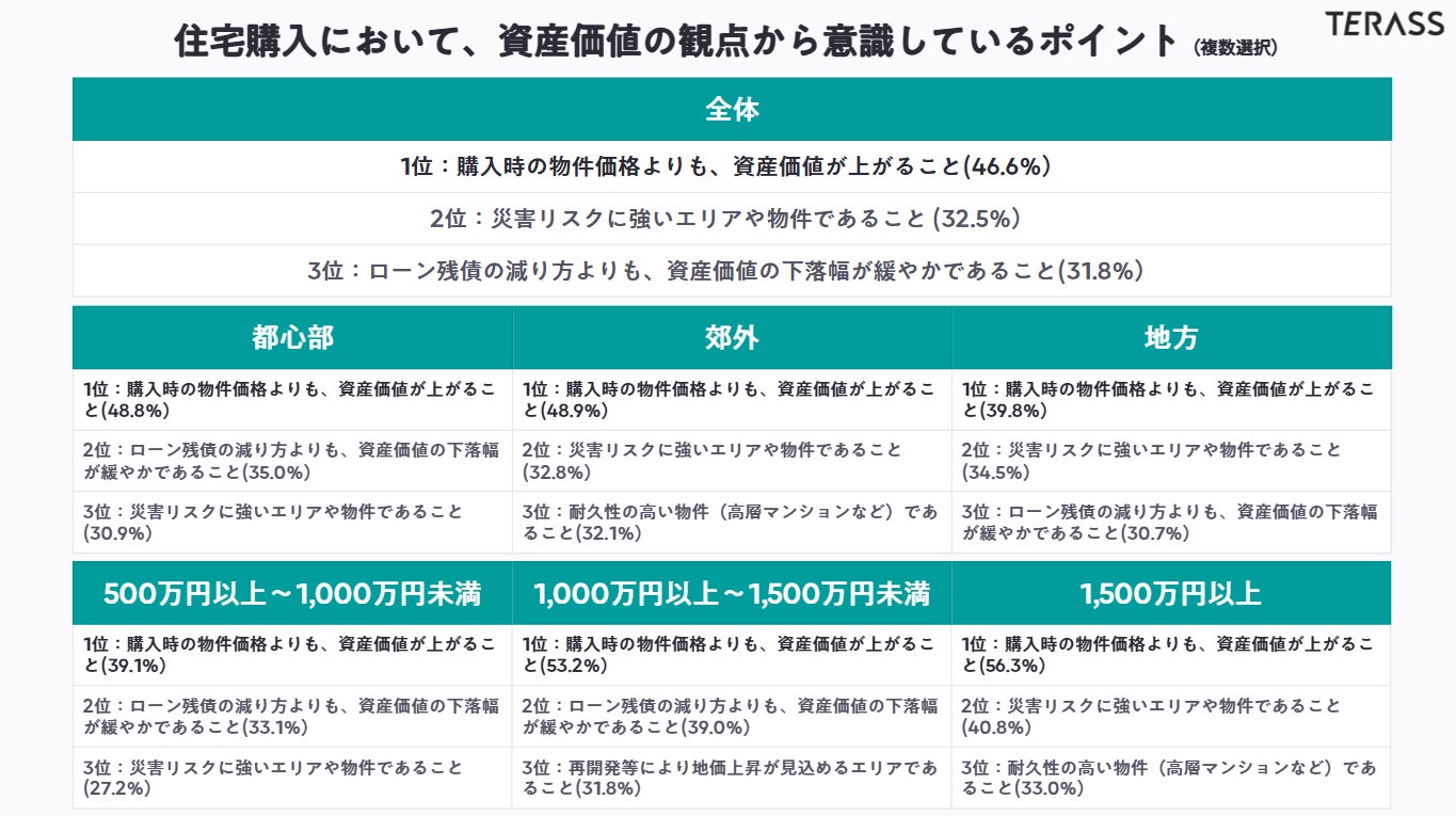 住宅購入において、資産価値の観点から「購入時より資産価値が上がること」(46.6%)を意識している人が全体の中で最多となりました。居住エリア別に見ると、地方や郊外の居住者では「災害リスクへの強さ」を重視する割合も高い傾向にあり、都心居住者は「資産価値の下落幅が緩やかであること」も重視することが分かりました。エリアによって住宅購入時における価値基準に違いがあることが読み取れます。