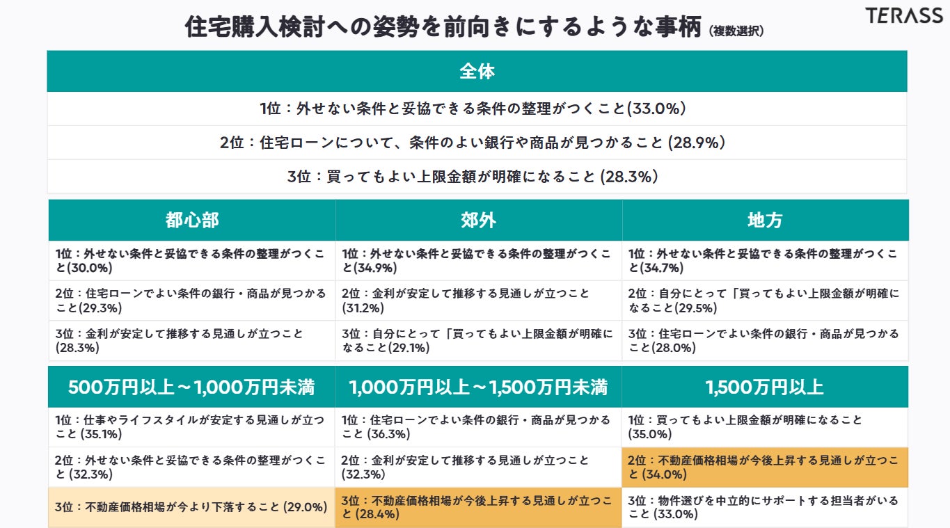 住宅の検討への姿勢を前向きにするような事柄として、全体の33%が「外せない条件と妥協できる条件の整理がつくこと」と回答しました。住宅検討におけるストレスを抱える層が多い都心居住者においては、年収500~1,000万円の層は「不動産価格相場が今より下落すること」を期待するのに対し、年収1,000以上の層は「上昇する見通しが立つこと」を期待する傾向も読み取れます。都心の高収入層ほど、現在の価格上昇局面を“購入の好機”と捉えていることが考えられます。