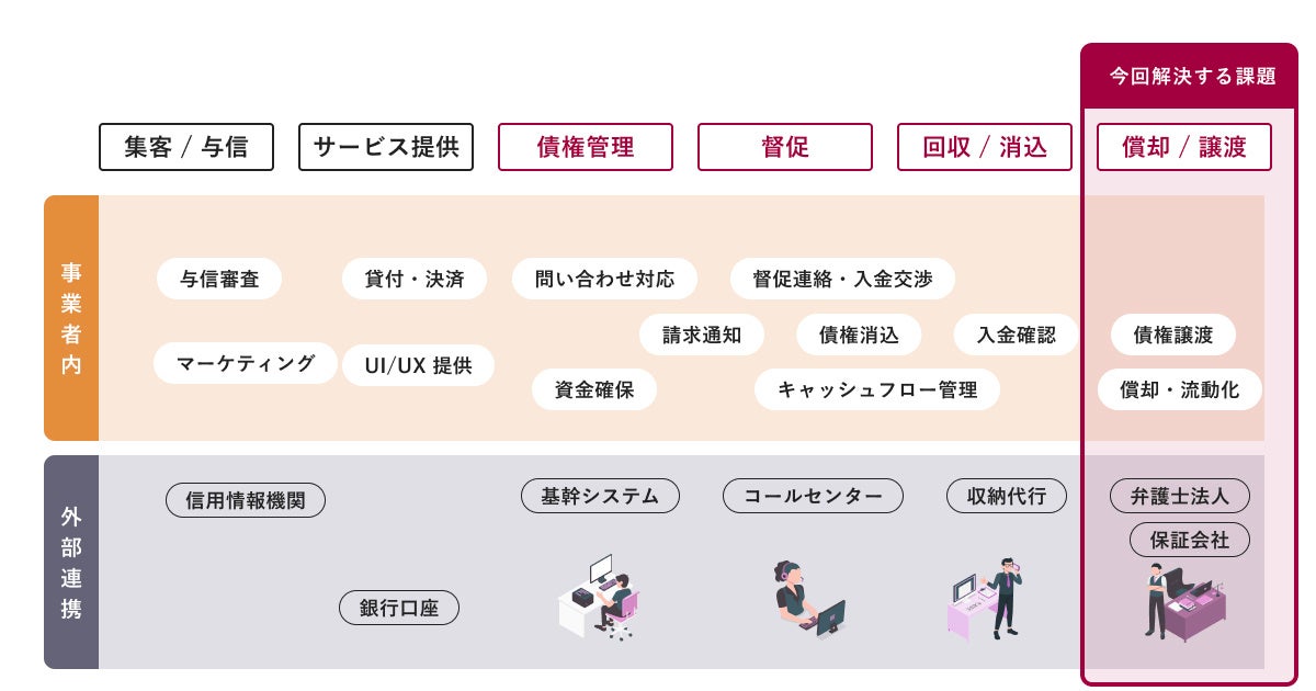 | ②新しく金融サービスを立ち上げる事業者 | ・煩雑になりがちな顧客管理データベースの構築 ・債権管理・督促回収までのオペレーション設計 ・財務状況の改善、事業の安定性確保 ・自社与信モデル構築のサポート 取引データを連携するだけで、債権管理、督促・回収・償却までのオペレーション機能を一括で立ち上げます。システム連携・事業モデルの構築にも伴走し、新規事業の成長をサポートします。 |