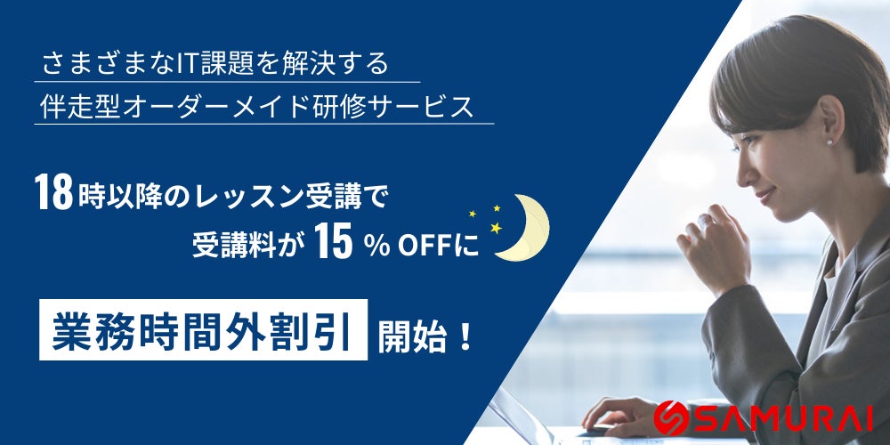 株式会社SAMURAI(本社所在地:東京都千代田区、代表取締役 :高比良 直人、以下:SAMURAI)は、企業のニーズや達成目標に応じてカリキュラムをフルオーダーメイドで作成できる法人向けプログラミング研修サービス「伴走型オーダーメイド研修」にて、18時以降のレッスンがお得に受講できる『業務時間外割引』を開始しました。
