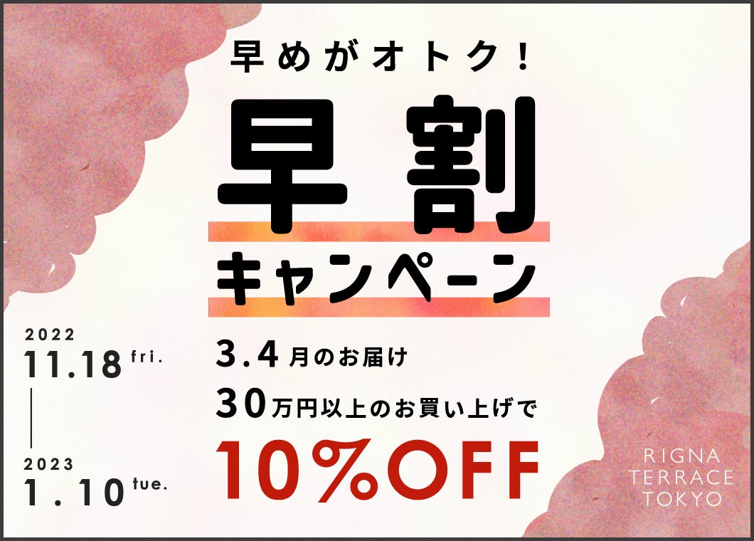 キャンペーン期間内に30万円以上(税込)ご購入いただいたお客様のうち、2023年3月1日(水)から4月30日(日)までに納品希望のお客様を対象に、10%オフとなるキャンペーンを実施します。