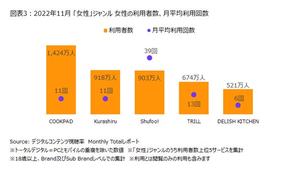 最後に、女性のみの利用状況をサービス別に見ると、利用者数ではCOOKPADが最も多く1,424万人で、Kurashiruが918万人で続いていました。また、月平均利用回数ではShufoo!が39回で最も多く、TRILLが13回で続いていました(図表3)。