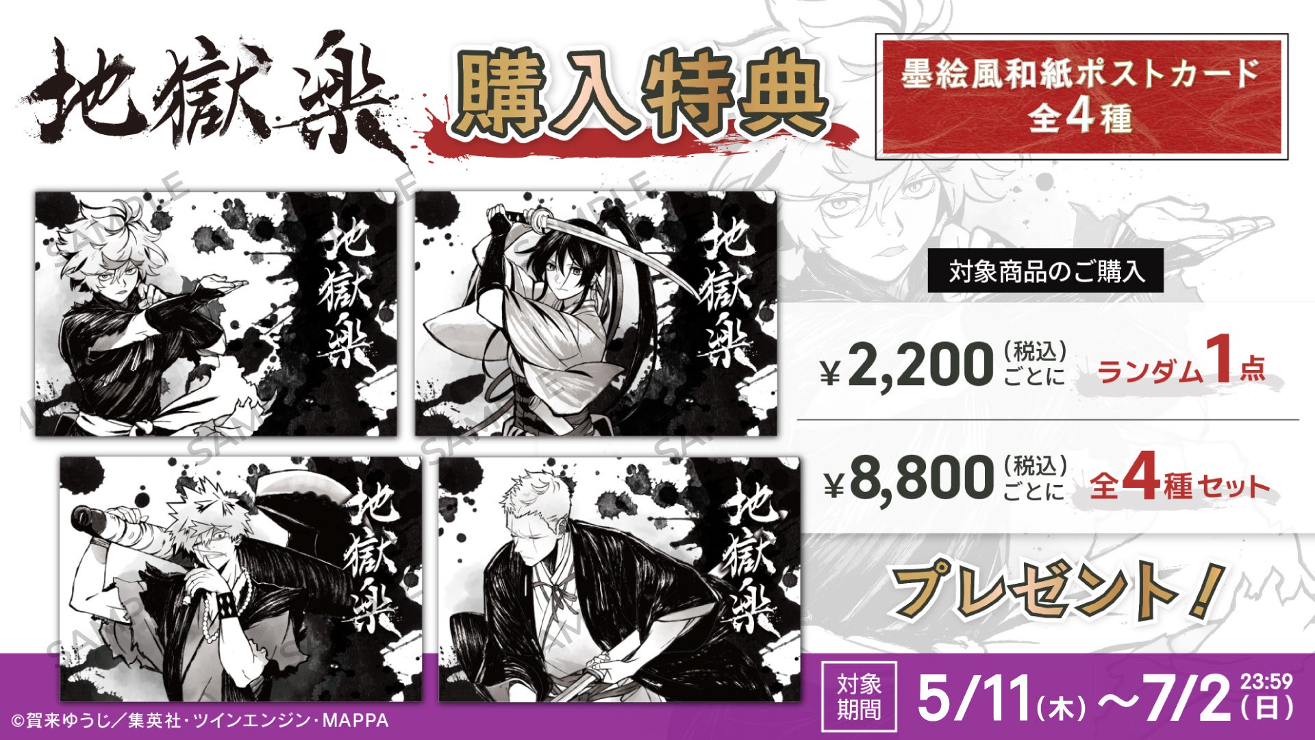 販売期間中(2023/5/11~7/2)、TVアニメ『地獄楽』の合計注文金額2,200円(税込)お買い上げごとにランダムで特典(全4種)を1枚、8,800円(税込)お買い上げごとに特典(全4種セット)を1セットプレゼントいたします。