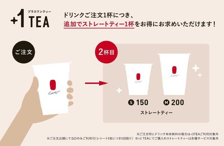 レシート発行日、発行店舗にてクルーにご提示の上、+1 TEA (プラスワンティー)
