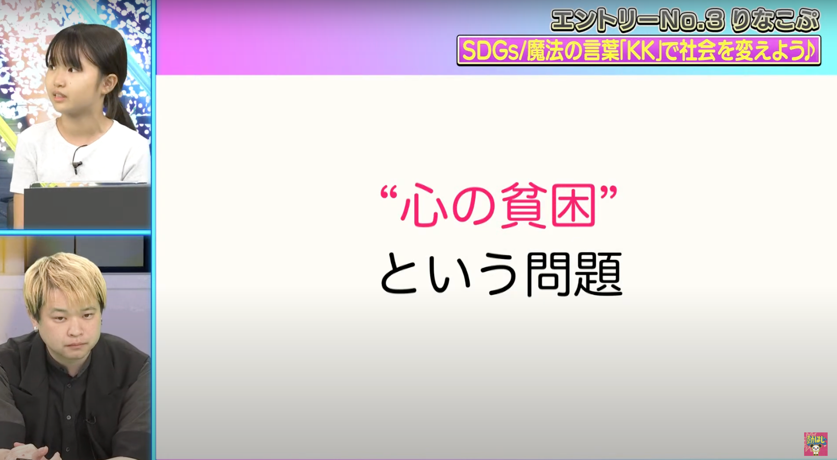 社会をより良くする取り組みやアイデアを発信する「SDGsチャレンジアワード」で「魔法の言葉『KK』で社会を変えよう♪」というテーマのプレゼンを発表したのは、小学5年生のりなこぷさん。世界の貧困問題を調べる中で、貧困地域の子どもたちが笑顔で幸せそうに見えるのに、お金やモノに恵まれていても悲しそうに見える人がいることに疑問を感じ、「心の貧困」に目を向けたと言います。