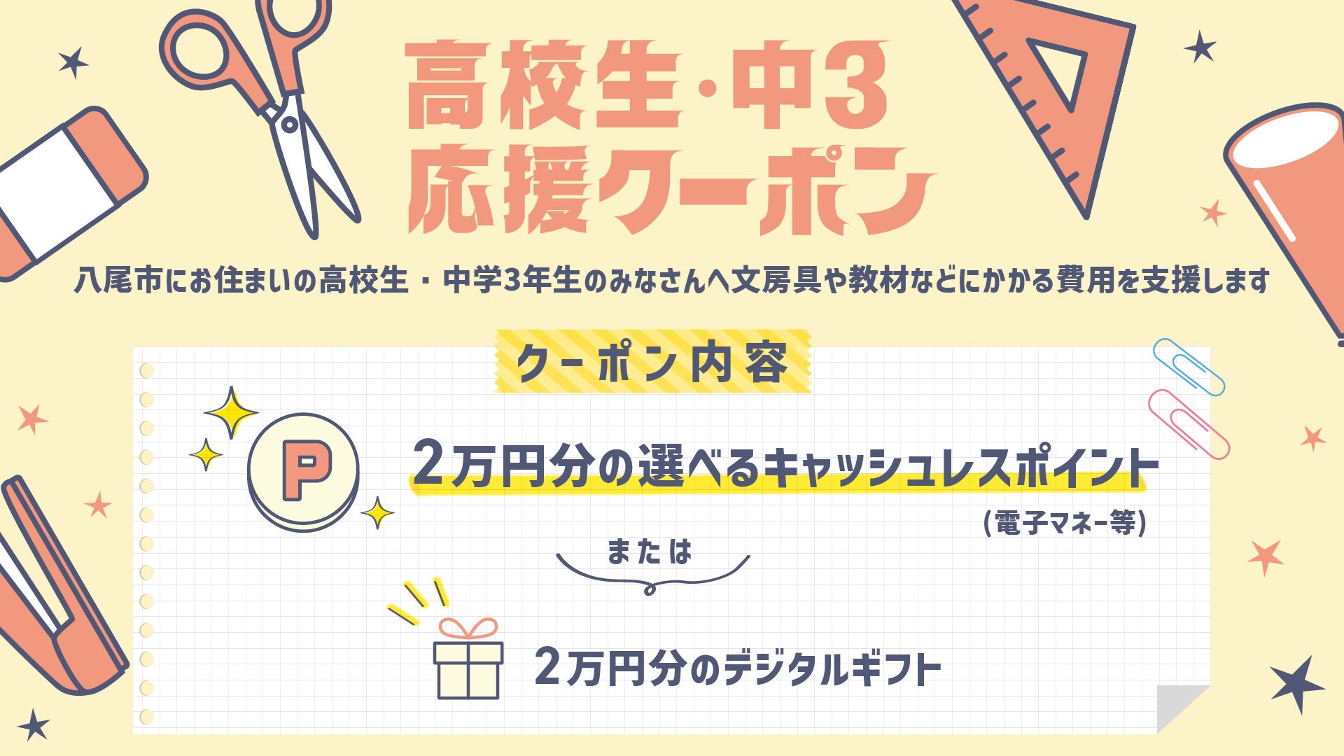 大阪府八尾市では、物価高騰が長期化する中、生活や修学等に大きな影響を受ける中学3年生及び高校生相当年齢の児童を対象に、生活必需品や修学に必要な消耗品(文房具、教材等)等の費用を支援するため、デジタルクーポンの配付を実施しています。
