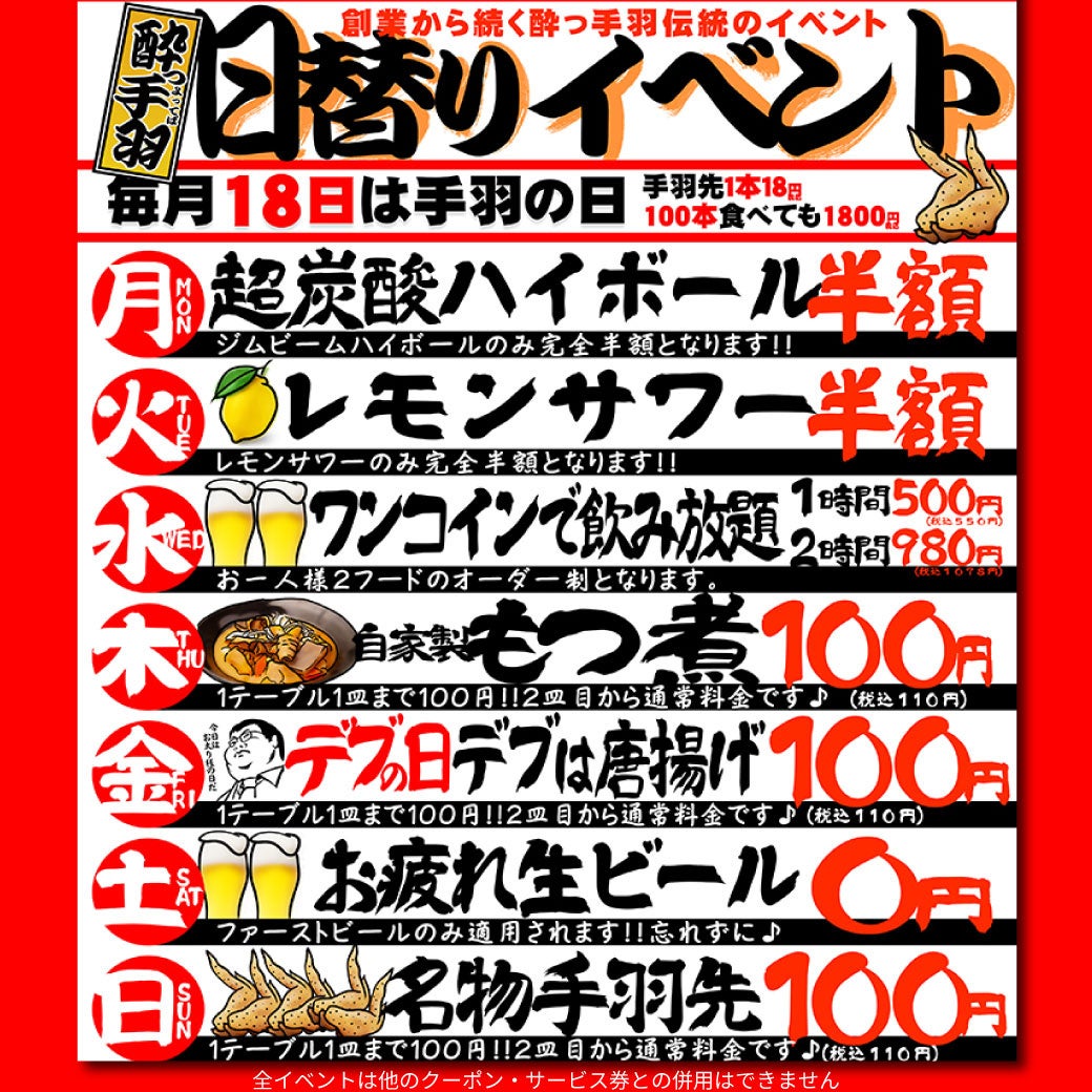 居酒屋革命 酔っ手羽 天神店の「日替りイベント」