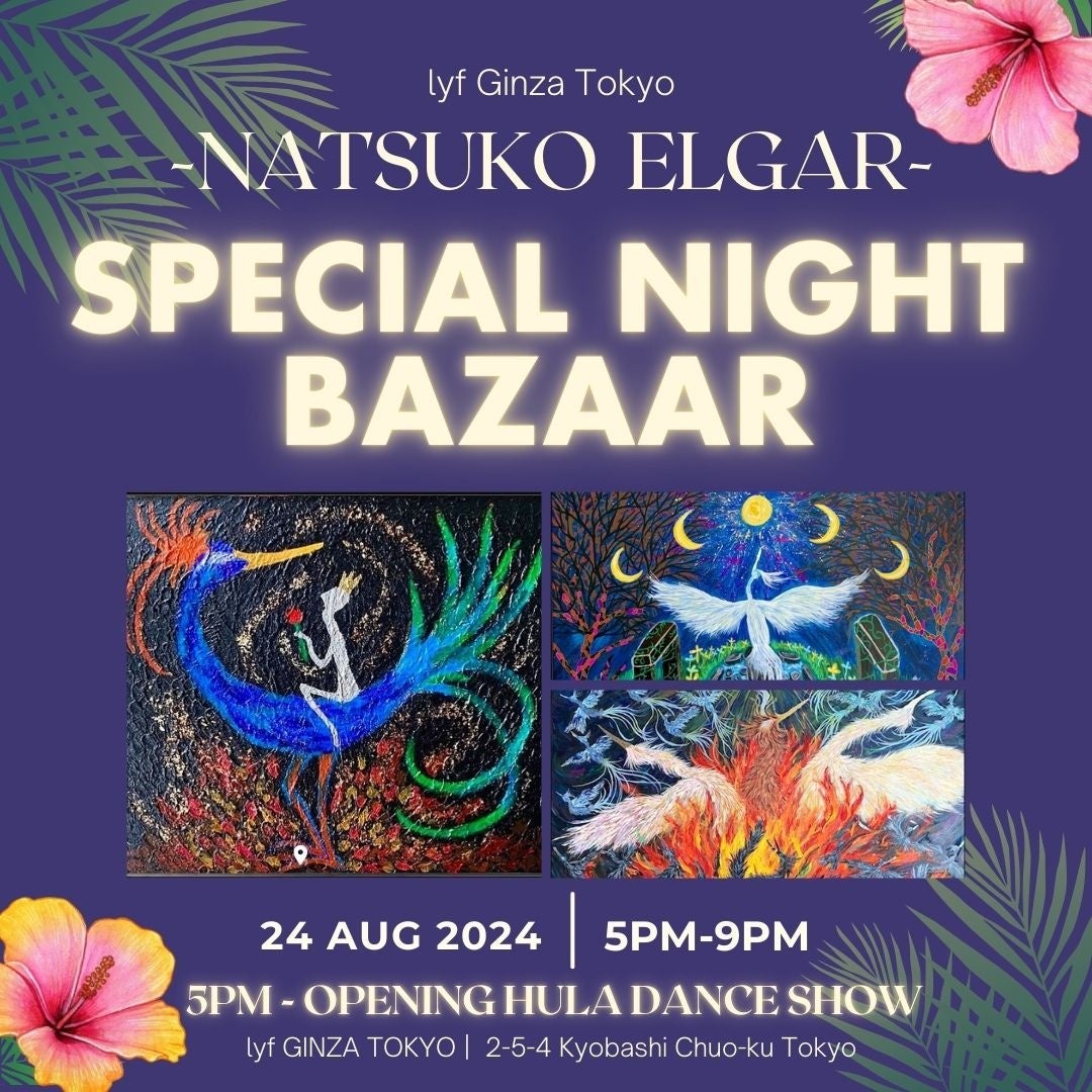 カラフルでエネルギーに溢れた作品が魅力のナツコ エルガー氏、初のマーケットイベント。これまで未公開だったナツコ氏のアート作品を一挙に展示、ソーシャルスペースCONNECTがアートのエネルギーに包まれます。購入も可能です。また24日の夜は、アートをテーマとしたフラダンスショーも開催、ただ見るだけではないアートの楽しみ方を提供します。ナツコエルガーワールドに浸れる2日間。夏にぴったりな時間をカジュアルにお酒を飲みながら昼と夜で違うアートが楽しんで、あなたのお気に入りを見つけてみて!