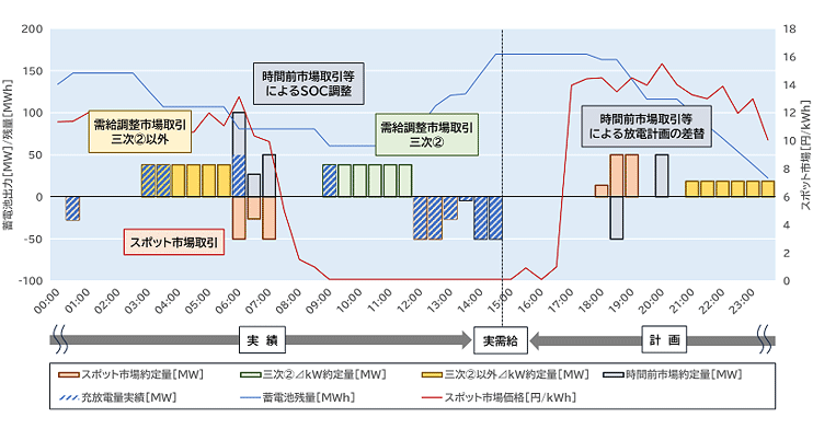 30分コマごとのDER最適運用計画および最適入札計画を提供します。また、運用計画・実績のレポーティングも提供可能です。例えば図2では、策定された充放電計画とそれに基づく充放電実績、および15:00の実需給時間帯以降に予定されている充放電計画を示しています。