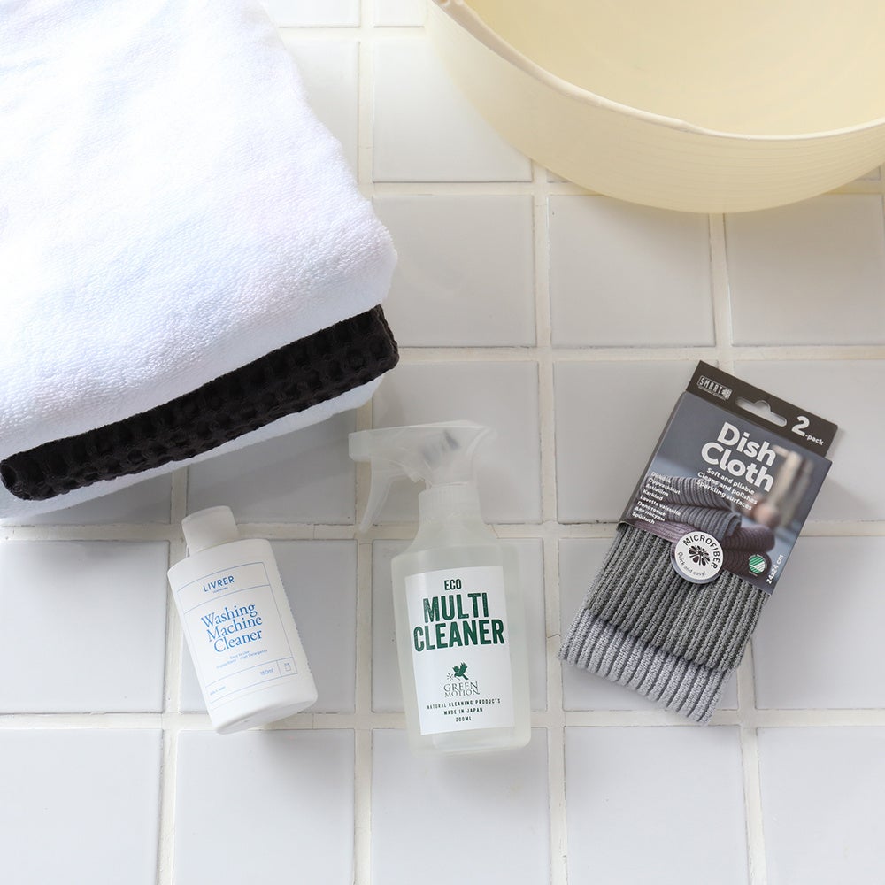 おうちランドリーの基本は洗濯槽をきれいにすること。「LIVRER」の洗濯槽クリーナー、そして洗濯機の外側はECO MULTI CLEANERを使ってきれいに。