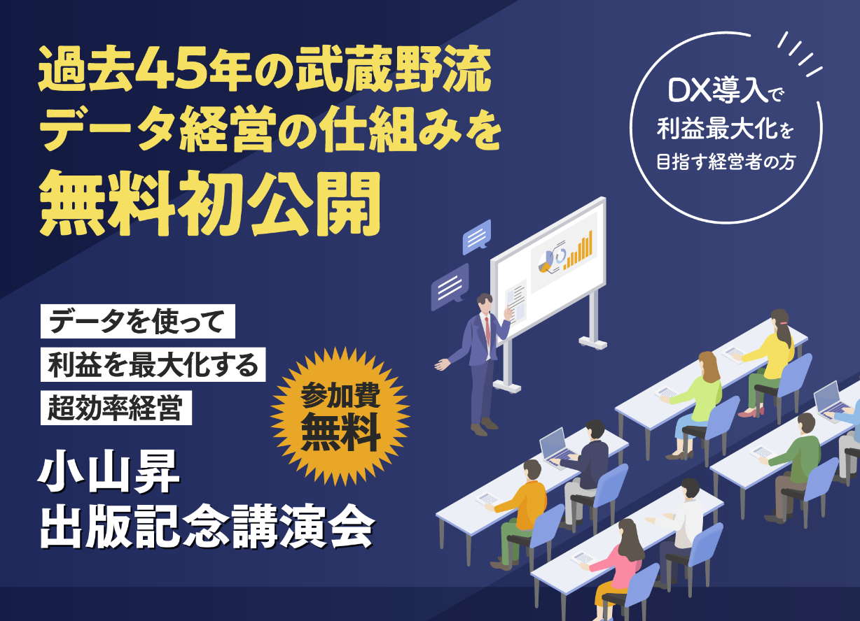 該当書籍『データを使って利益を最大化する 超効率経営』(あさ出版)をもとに、「武蔵野流データ経営」の仕組みを時間の許す限り、小山自身が解説します。