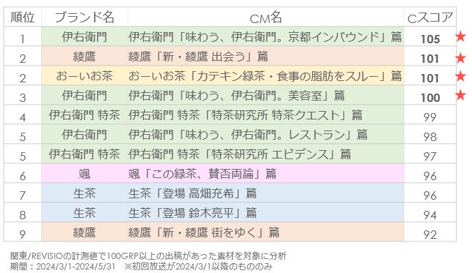 REVISIOでは、CMクリエイティブを評価するための独自指標・Cスコアによって、2024年3月~5月に放映された緑茶飲料の新CMをランキング化しました。その結果、この春視聴者を最もくぎづけにした緑茶飲料新CMは、サントリー 伊右衛門「味わう、伊右衛門。京都インバウンド篇」であることがわかりました。