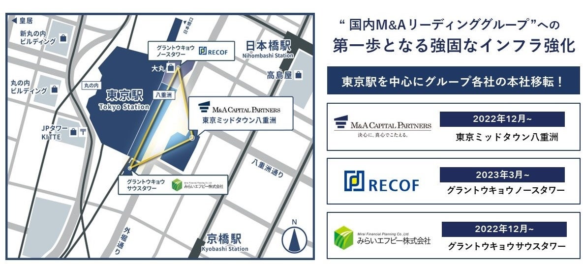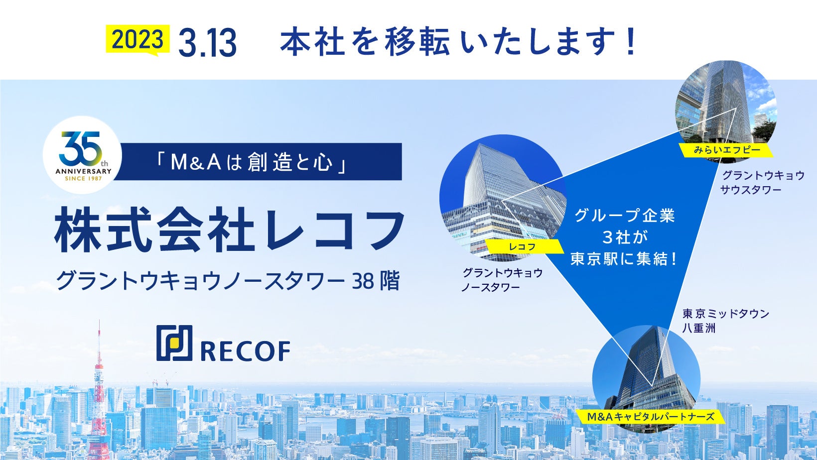 M&Aキャピタルパートナーズ株式会社(東京都中央区・代表取締役社長 中村悟、以降MACP)は、グループ会社で創業35周年を迎えた株式会社レコフ(東京都千代田区・代表取締役 中村悟、岩口敏史)が、2023年3月13日に本社を東京駅直通のグラントウキョウノースタワーへ移転することをお知らせいたします。企業再生のパイオニアであるみらいエフピー株式会社を含めたグループ3社が東京駅周辺に集結をしたことで、これまで以上にグループの連携を深め、顧客の皆様にこれまで以上のサービスをグループ一同提供してまいります。
