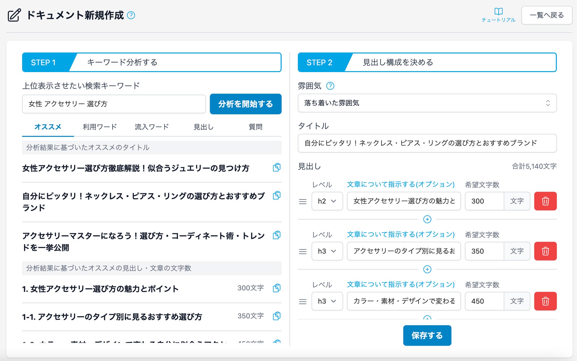 [上位表示させたい検索キーワード]を入力して、分析を行うと、記事に最適なタイトルや見出し、文章の文字数が自動的に提案されます。