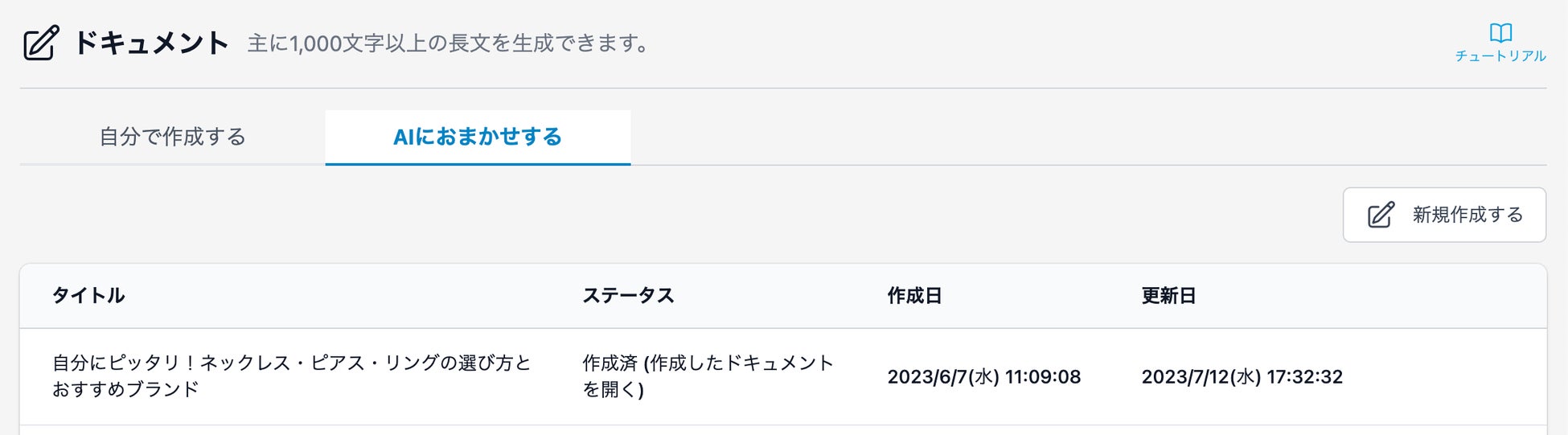 Transcopeの[ドキュメント]メニューの[AIにおまかせする]タブから、[新規作成する]ボタンをクリックしてください。