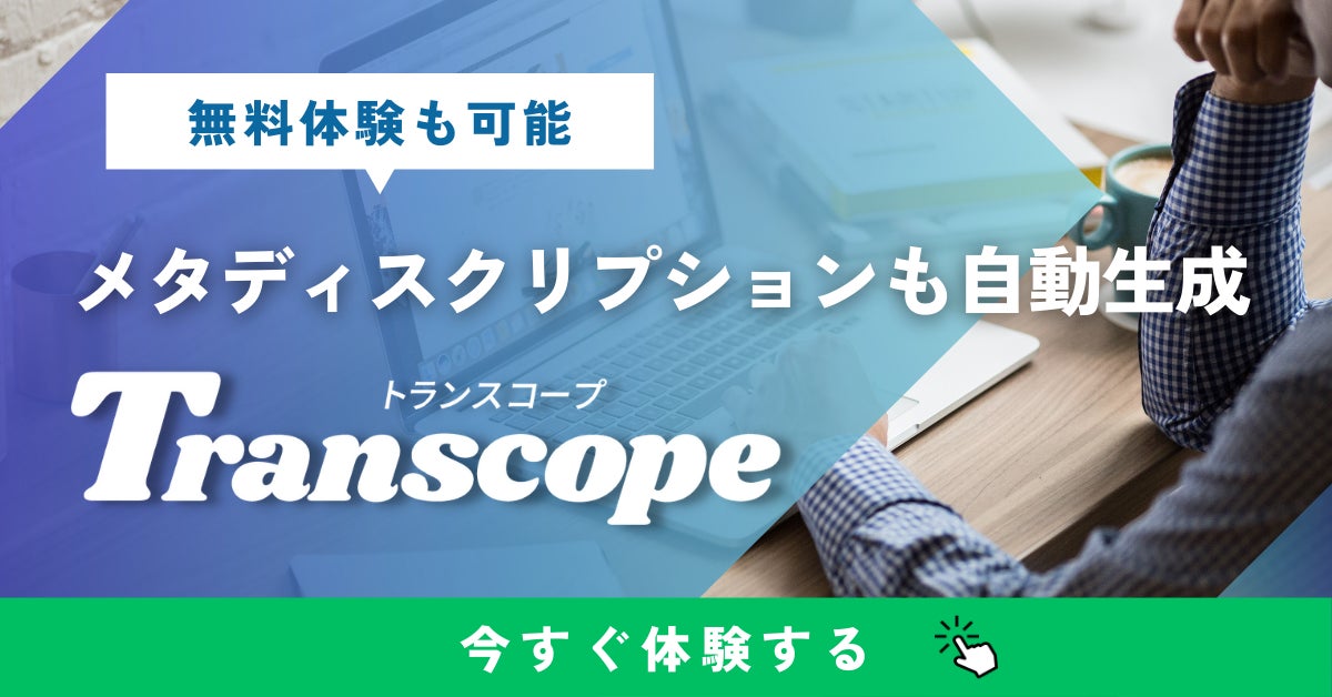シェアモル株式会社(本社:東京都墨田区、 代表取締役:齋藤 康輔)は、2023年7月20日、SEOに強いAI(GPT-4)ライティングツール「Transcope(トランスコープ)」において、タイトルと見出しを入力するだけで適切な文字数のメタディスクリプションが自動生成される機能をリリースいたしました。