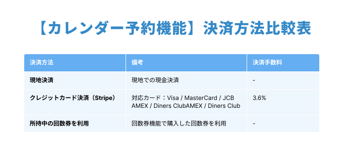 カレンダー予約時の決済方法は、Lメンバーズカードの管理画面上で簡単にカスタマイズすることが可能です。決済方法は、「現地決済」「事前決済(クレジットカード決済)」「所持中の回数券を利用」から選択することができます。