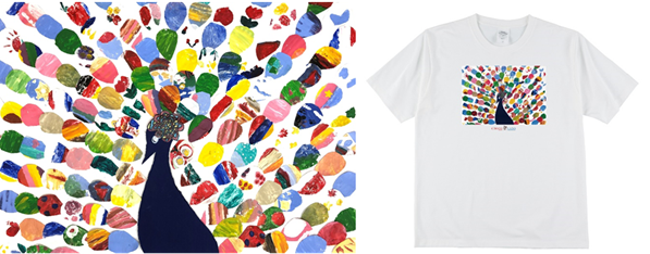 廃材となる品質表示ラベルの台紙や段ボールを使い、約40名の障がい者メンバーが、「幸せ」に感じる色をクジャクの羽に想い想いに描いたエシカルな作品です。