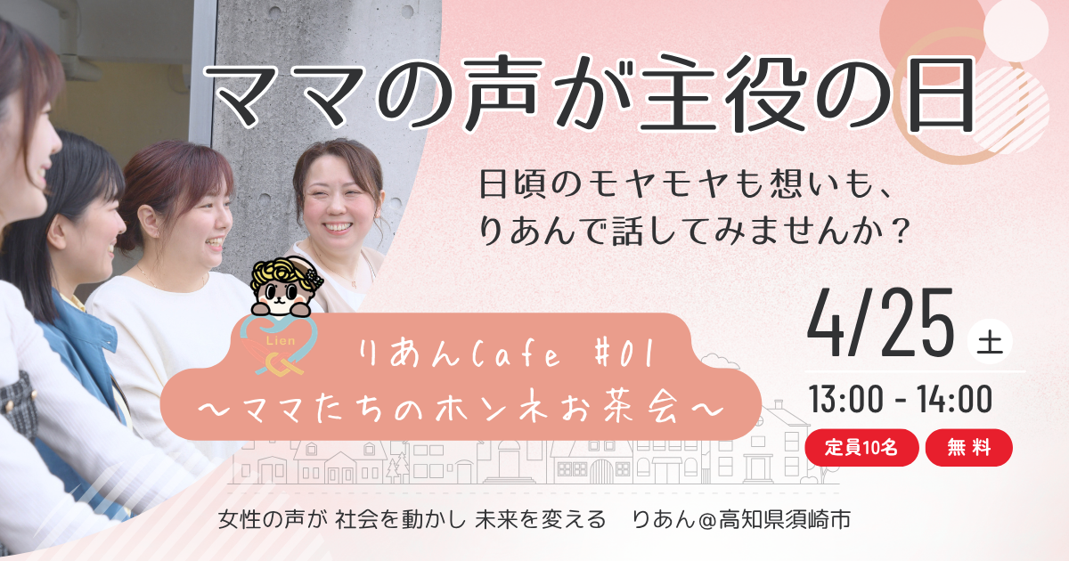 一般社団法人日本シングルマザー支援協会(代表理事:江成道子)は、高知県須崎市より委託を受け運営するサテライトオフィス『りあん』にて、2026年4月25日(土)、「りあんCafe #01 ママたちのホンネお茶会」を開催いたします。