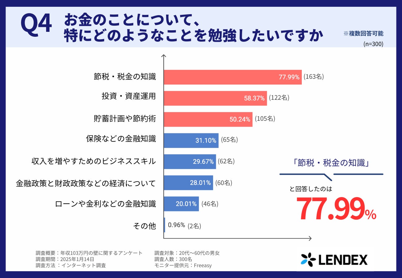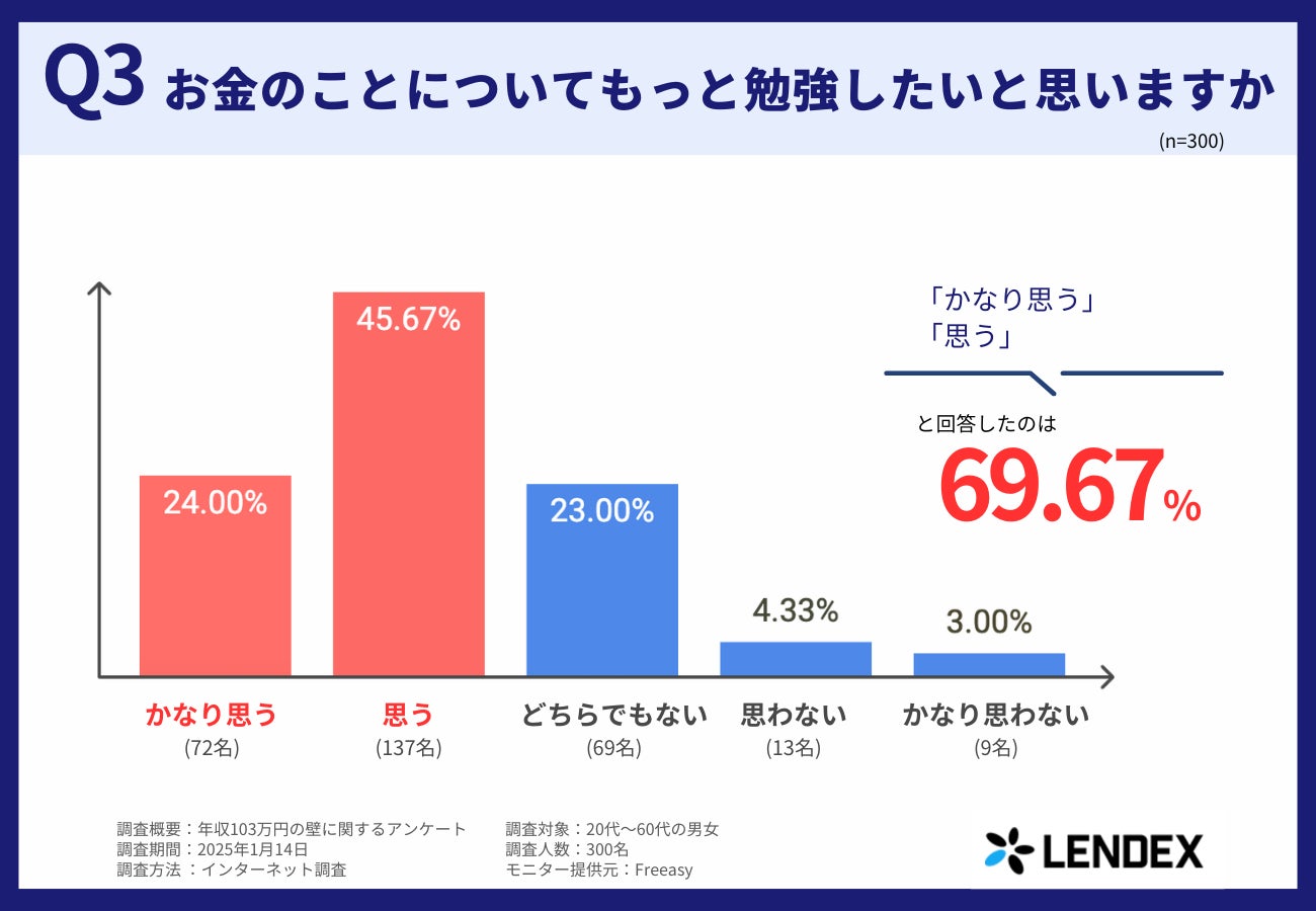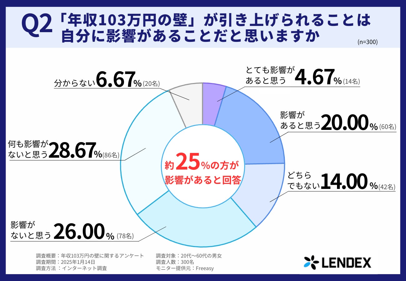 そこで今回、融資型クラウドファンディングサービスを提供する株式会社LENDEX(https://lendex.jp )は、20代から60代の男女を対象に、「年収103万円の壁」に関する意識調査を行いました。